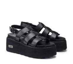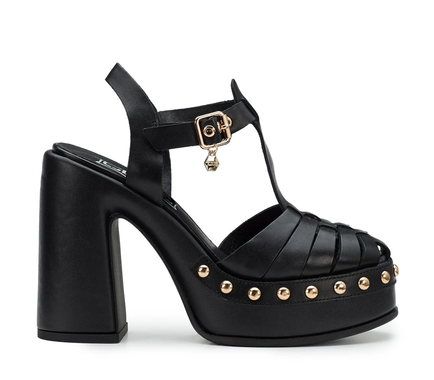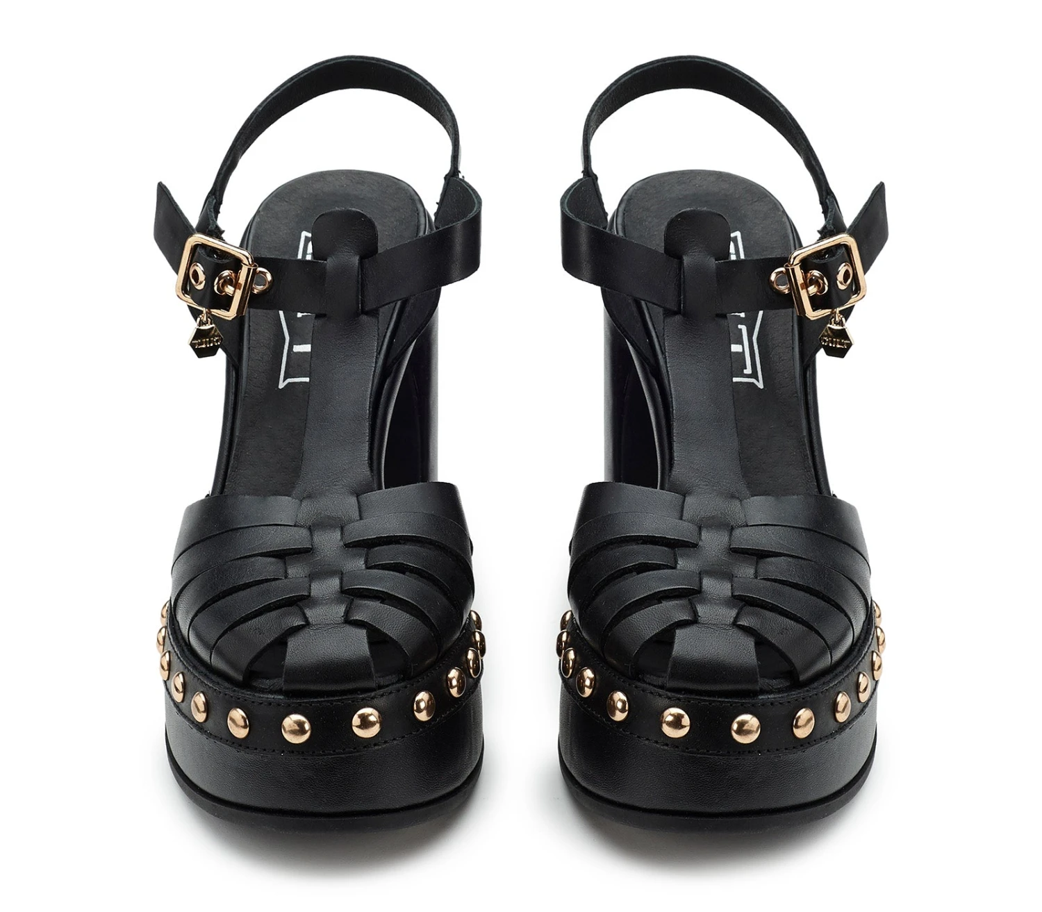 Realizzato in pelle nera, questo sandalo interpretato in chiave chic da Cult per infondere una nuova sicurezza ai look femminili. Il modello ha un appeal esuberante con plateau alto, un robusto tacco a blocco, punta con il design a gabbia e borchie sferiche color oro che amplificano lo stile audace del brand. Altezza tacco 12cm.