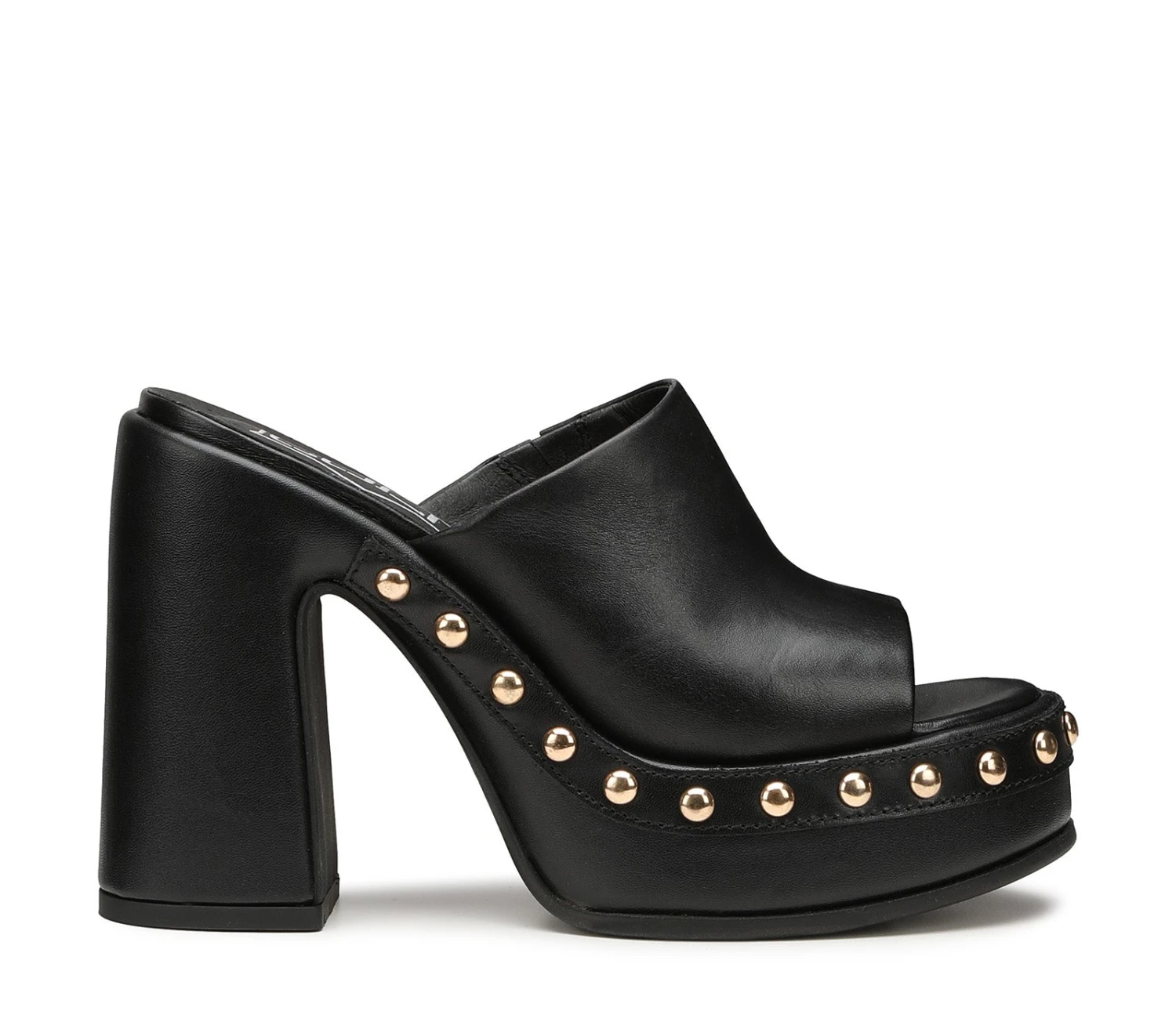 Realizzato in pelle nera, questo sandalo sabot interpretato in chiave chic da Cult per infondere una nuova sicurezza ai look femminili. Il modello ha un appeal esuberante con plateau alto, un robusto tacco a blocco e borchie sferiche color oro che amplificano lo stile audace del brand. Altezza tacco 12cm.