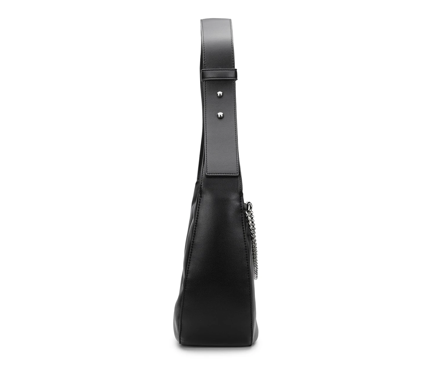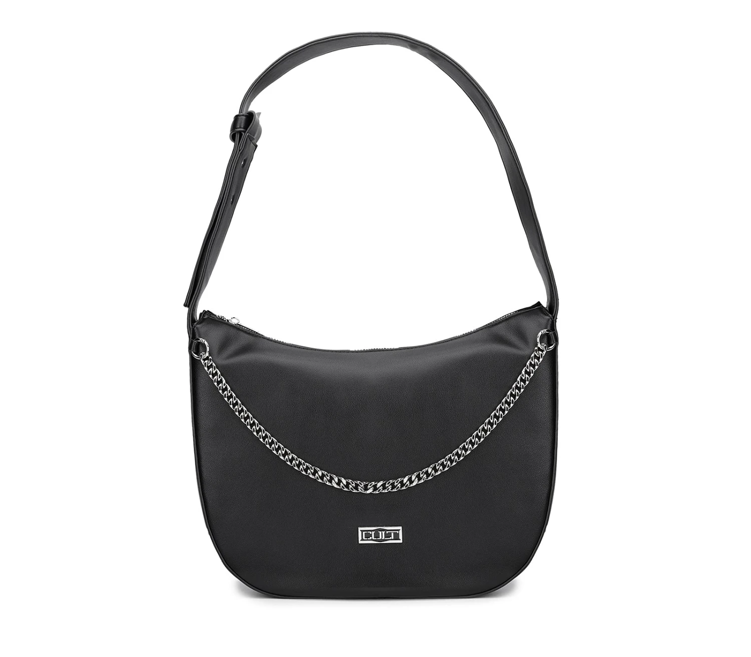 Capiente e rock, la nuova borsa a spalla firmata Cult è un accessorio da non lasciarsi sfuggire. Realizzata in ecopelle nera effetto cracklé, impreziosita dalla targhetta metallica con il logo del brand e una luminosa catena metallica, vi accompagnerà nelle giornate più indaffarate a spalla grazie al comodo manico largo. Dimensioni 34x26x11. Chiusura con zip.