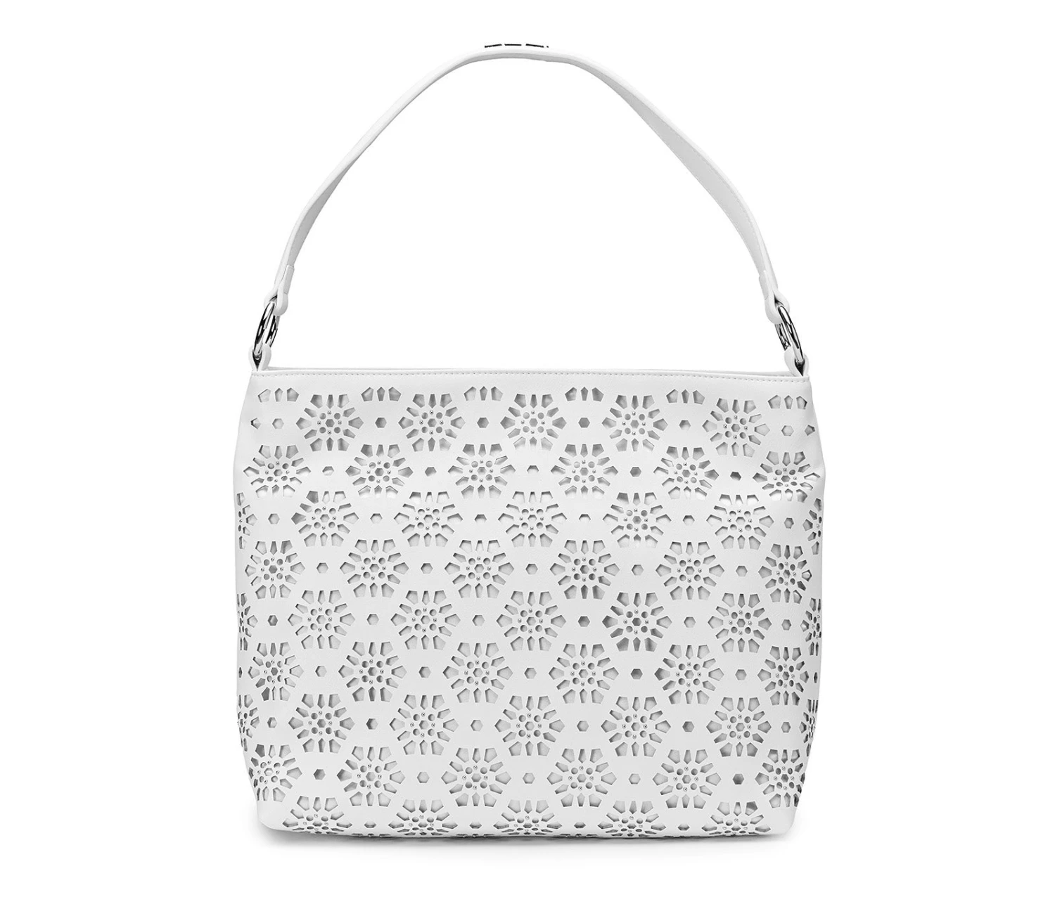 La nuova hobo bag NINA in ecopelle bianca firmata CULT, pensata per la stagione primavera-estate 2025, unisce eleganza e carattere. Arricchita da mini borchie bubble in metallo color argento, dettagli floreali cut-out e il logo lettering del brand, questa borsa aggiunge un tocco decisamente glam-rock al tuo look. Un vero must-have per non passare inosservata. Tracolla inclusa. Dimensioni: 31x28x11.