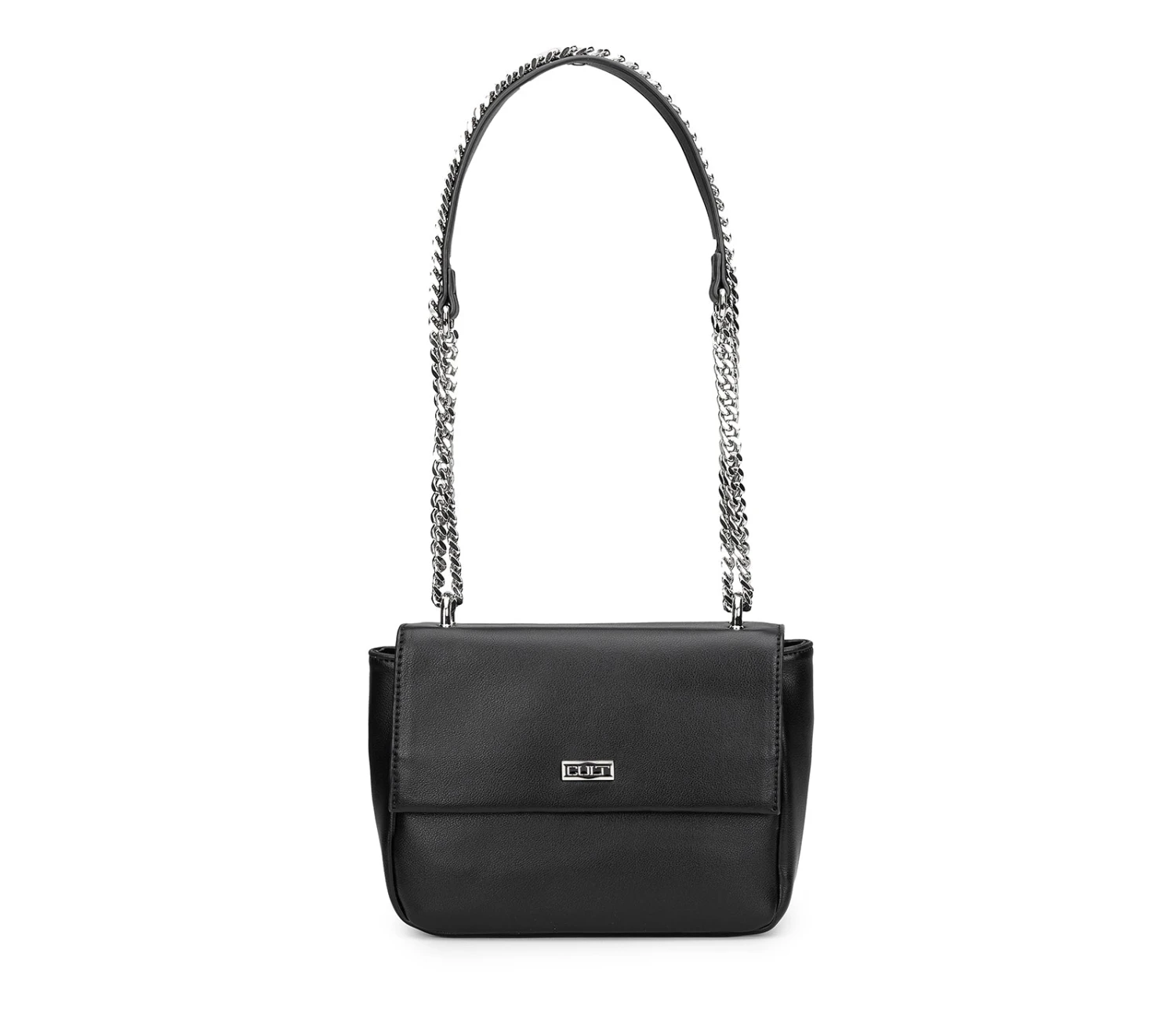 Infondete il vostro stile con la visione glam rock di Cult con questa borsa a tracolla. Realizzata in ecopelle nera effetto cracklé, ha la caratteristica forma rettangolare e una tracolla a catena silver. Si distingue per l’applicazione della targhetta metallica con il logo del brand nella parte frontale. La sfoggerete a spalla o a tracolla, per godervi i pomeriggi in città a mani libere. Chiusura magnetica. Dimensioni 20x14x7,5