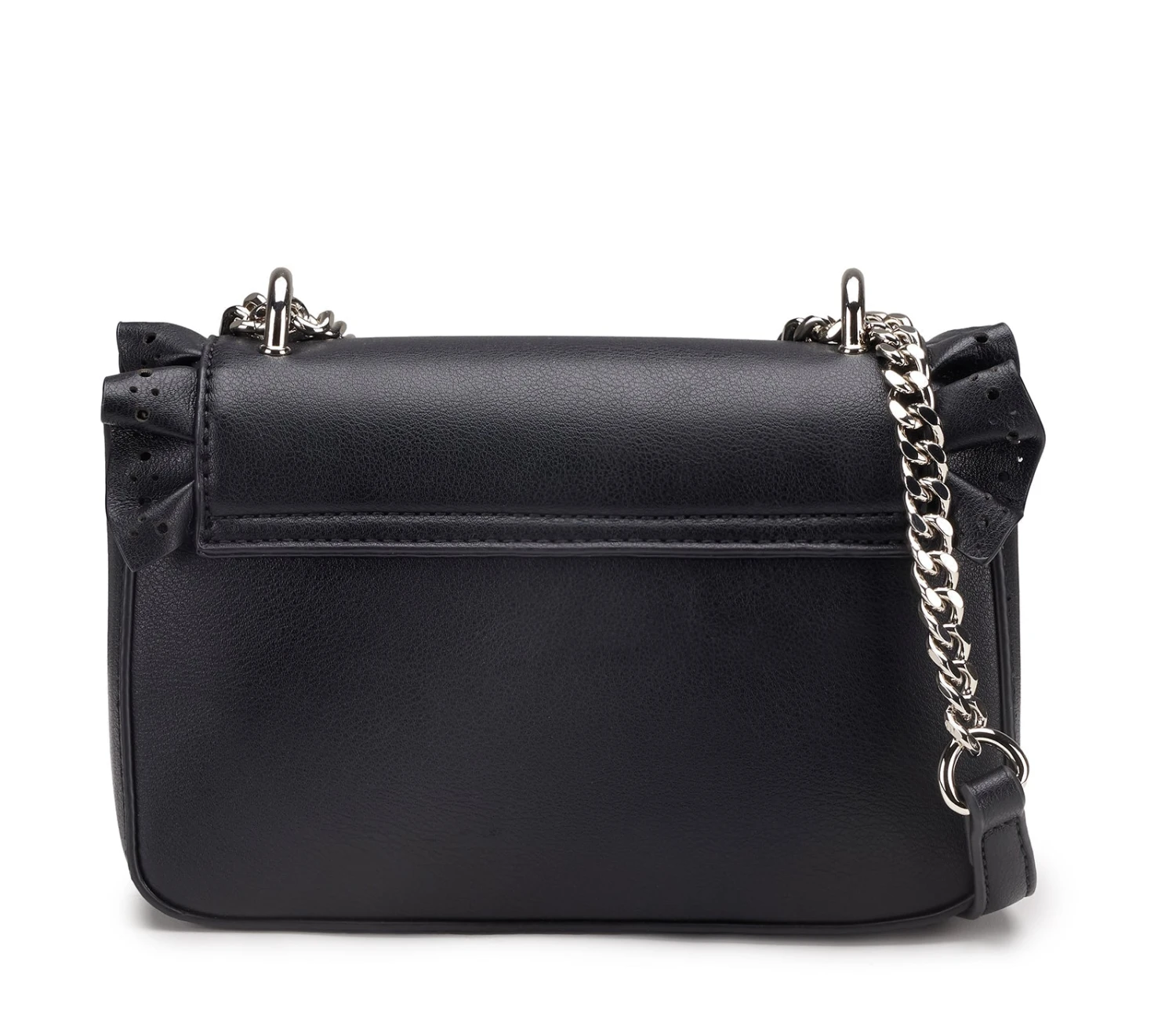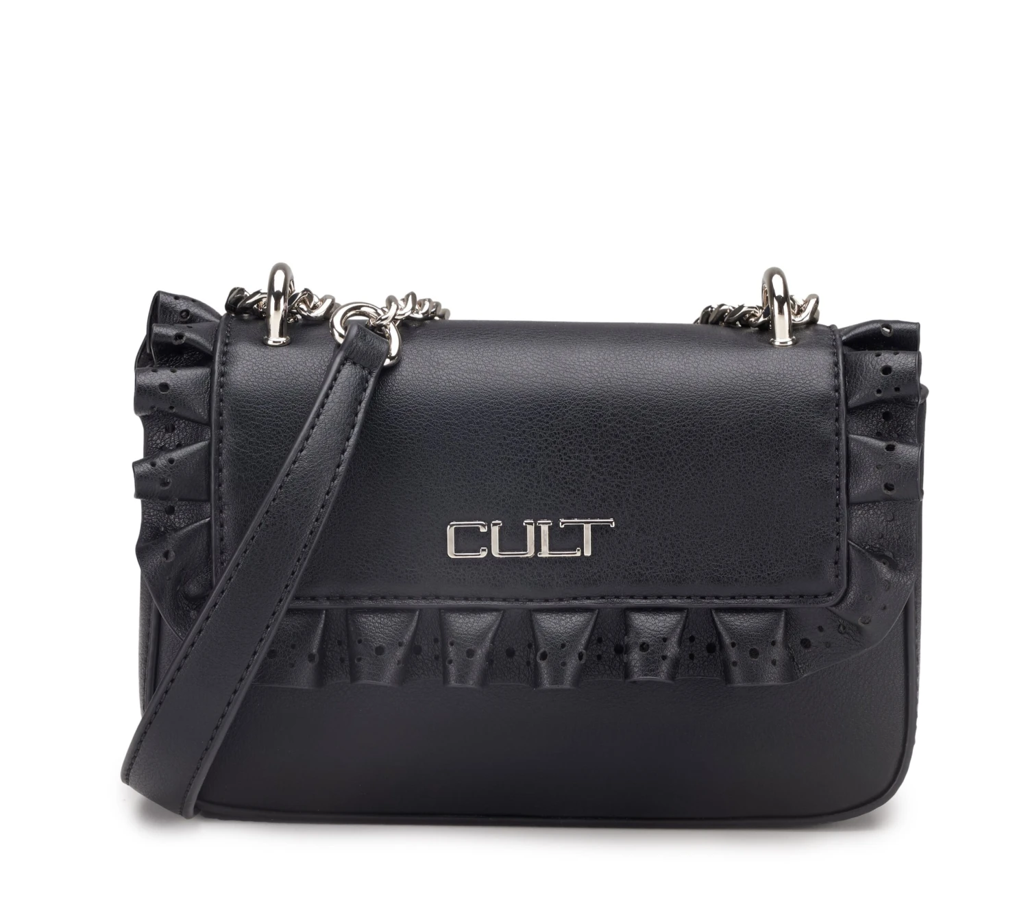 Rivoluzionate il vostro stile con la visione glam rock di CULT, grazie a questa nuova borsa a tracolla. Realizzata in ecopelle nera con forma rettangolare, è impreziosita da una tracolla in metallo a catena, dal logo lettering in rilievo e dalla presenza di morbide rouches sur ton sulla patta. Perfetta per essere sfoggiata a spalla o a tracolla, per aggiungere un tocco romantico a tutti i vostri look. Dimensioni 20×11,5x 5.
