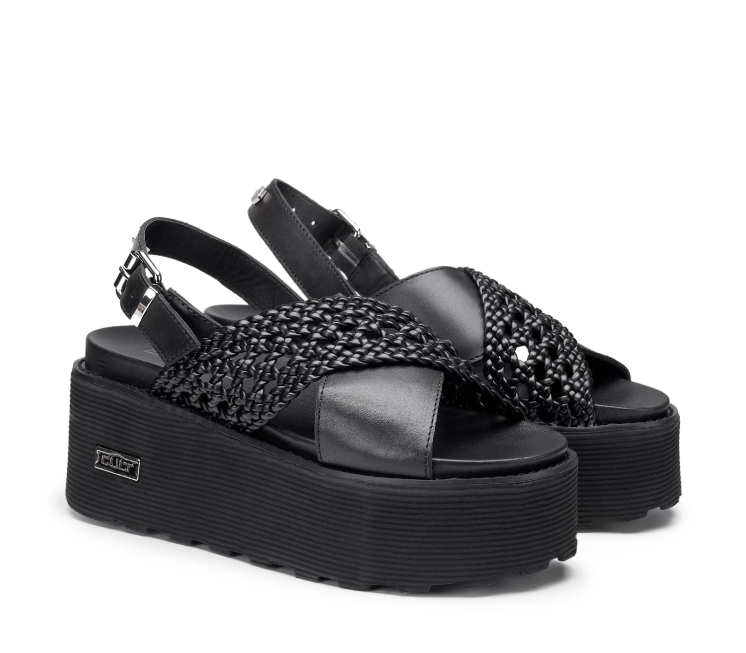 I sandali Nancy di CULT sono un vero must-have per questa stagione. Caratterizzati da una suola platform con logo metallico, presentano due fasce in pelle nera di cui una con lavorazione a intreccio, e un cinturino posteriore con fibbia che garantisce una calzata sicura. Dallo stile contemporaneo e minimal, sono perfetti per completare look freschi e dinamici. Ideali da abbinare a shorts e maxi-dress estivi per un risultato sempre di tendenza.