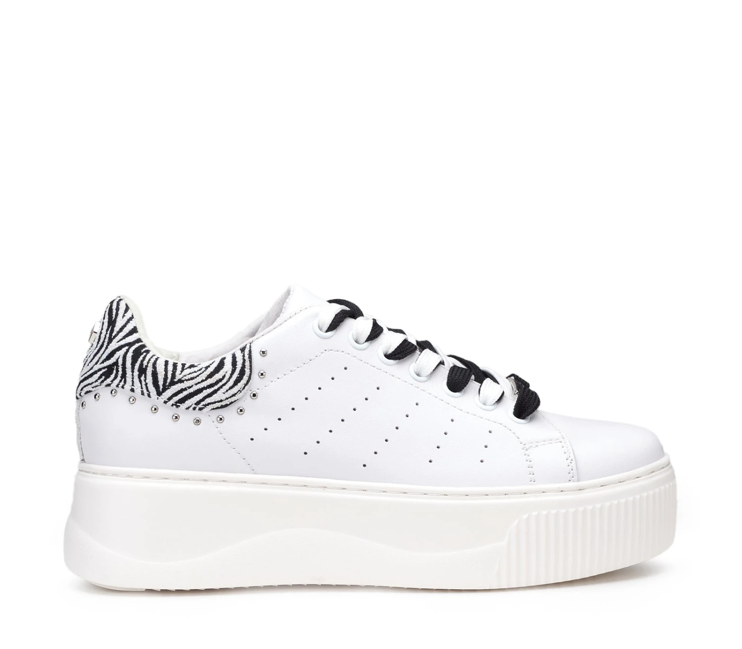 Dettagli animalier per le nuove sneakers PERRY in pelle firmate Cult per questa primavera/estate. Sono caratterizzate da lacci di color bianco e/o nero, da un contrafforte a contrasto in stampa zebrata e sono impreziosite da piccole borchie metalliche per un effetto davvero glamour. Da indossare sotto un vestito slim e blazer per un mix moderno e d’effetto.