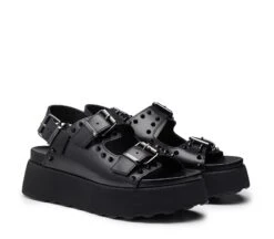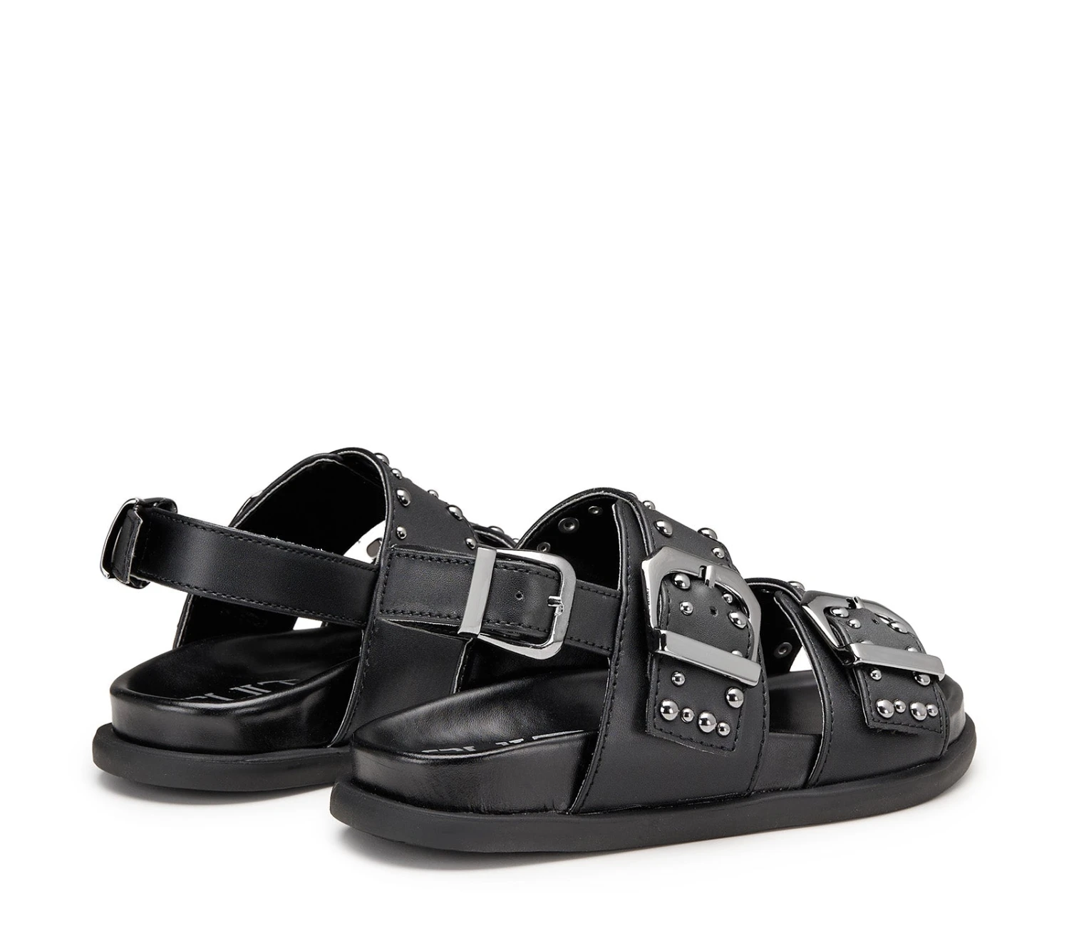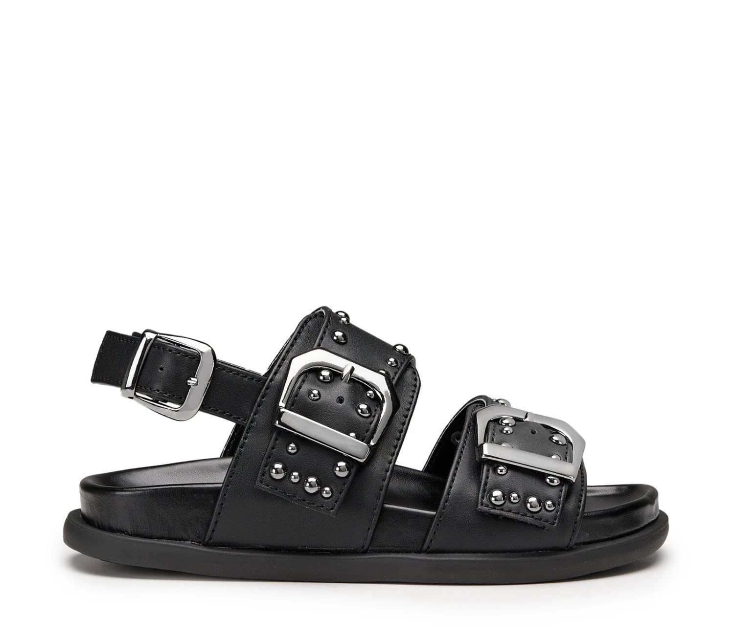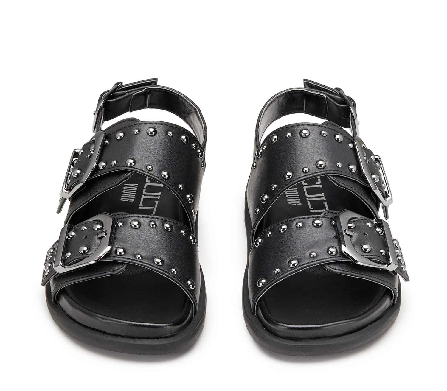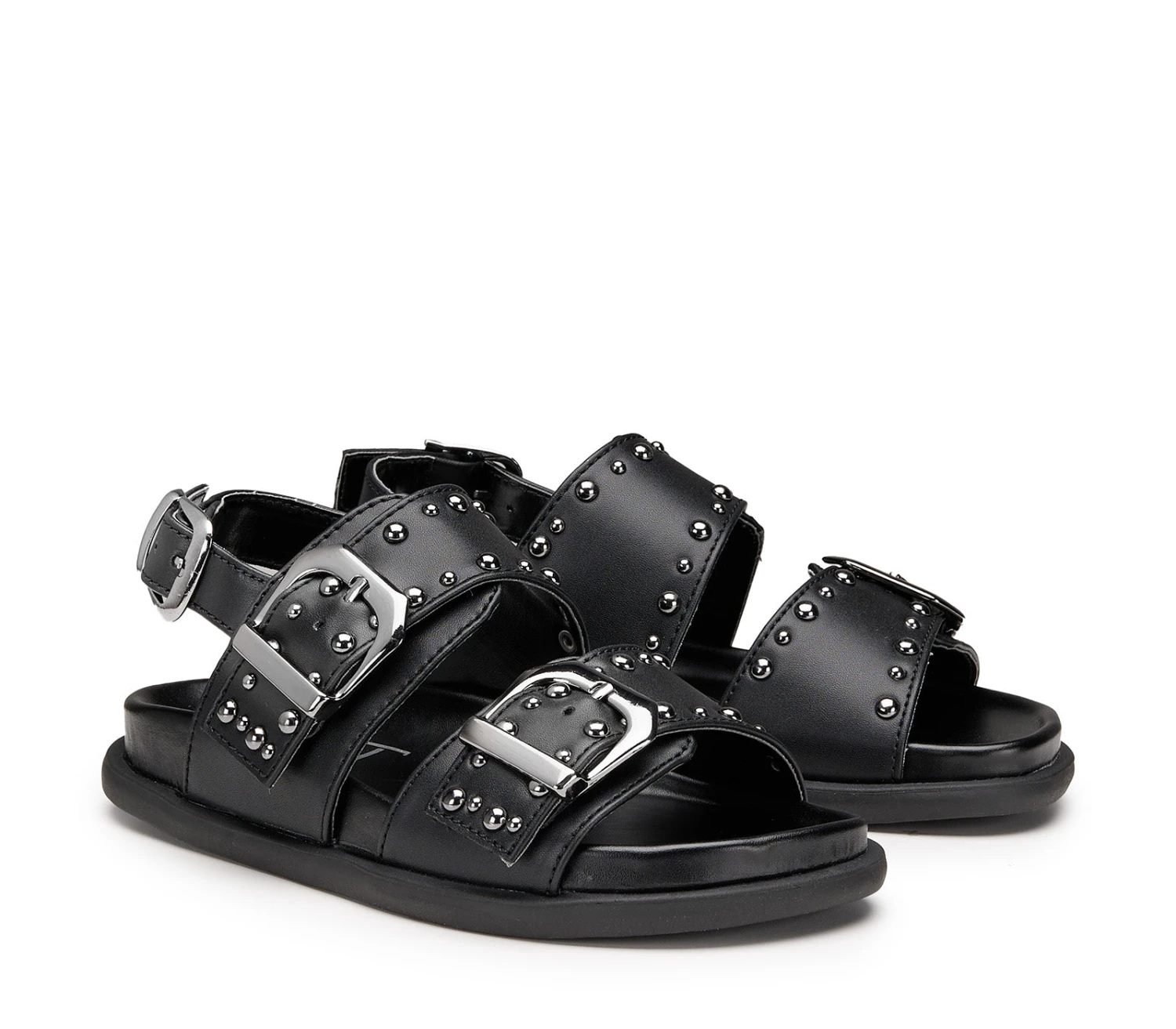 Il sandalo PATTY in ecopelle nero ha due cinturini regolabili con grandi fibbie argentate e borchie, più un cinturino sul retro per un supporto extra. Il modello ideale per un look estivo, rock e glam anche per i più piccoli.