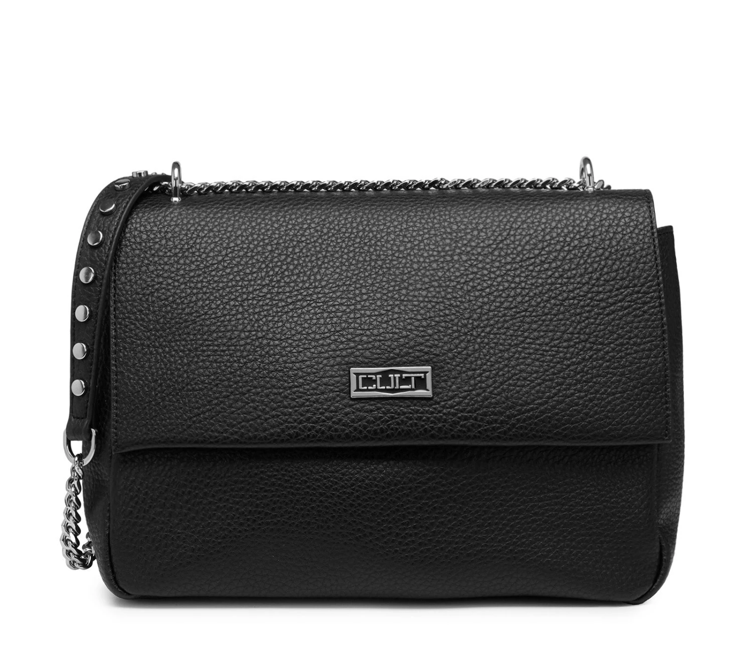 L’elegante borsa a tracolla ALISON in ecopelle nera firmata CULT si distingue per la sua linea minimal che le conferisce un aspetto moderno e originale. La chiusura con patta e il dettaglio metallico del logo in rilievo aggiungono un tocco di carattere, mentre la tracolla sottile con mini borchie silver aggiunge al design un elemento di stile. Perfetta per chi cerca un accessorio di tendenza, dal gusto audace e contemporaneo. Dimensioni 26,5×17,5×8.
