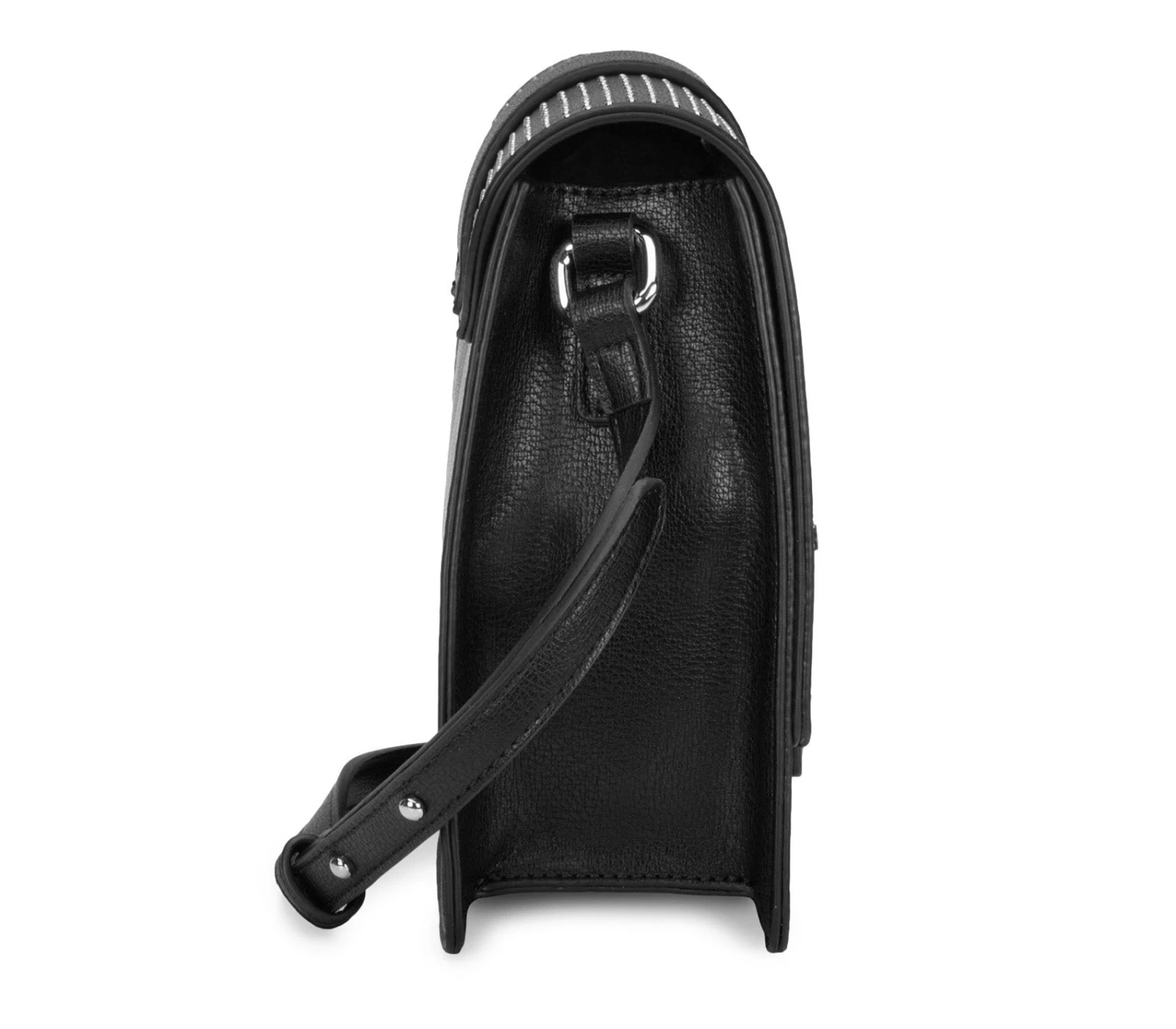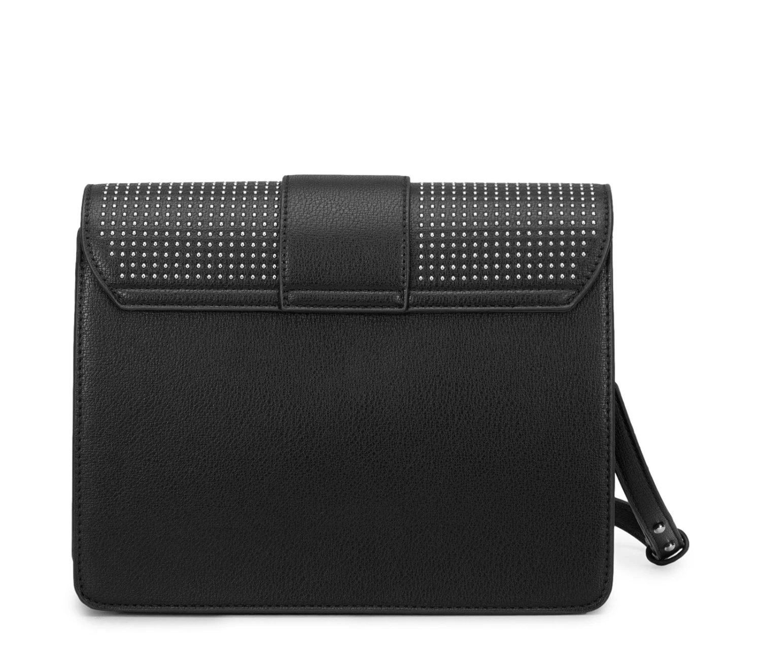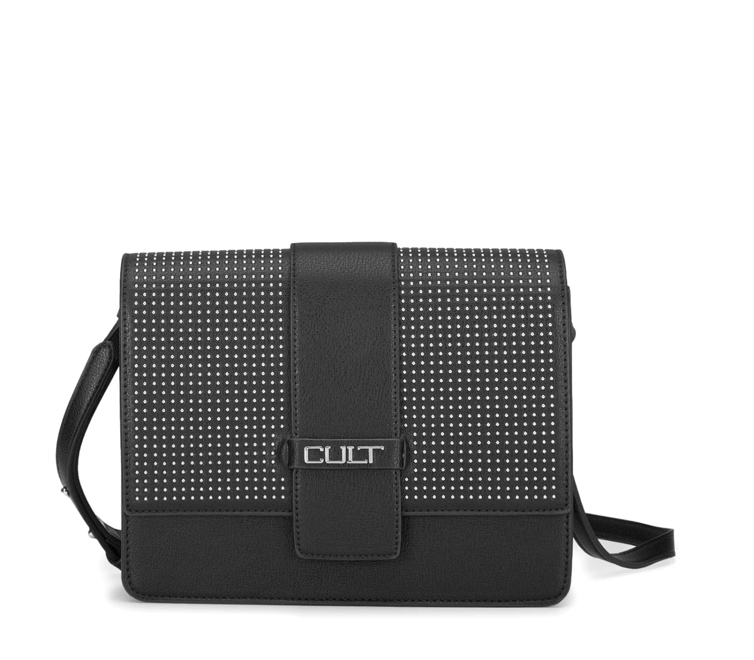 Infondete il vostro stile con la visione glam rock di Cult con questa borsa a tracolla. Realizzata in ecopelle nera, ha la caratteristica forma rettangolare e una tracolla sur ton. Si distingue per l’applicazione di micro borchie sferiche su tutta la patta. La sfoggerete a spalla o a tracolla, per godervi i pomeriggi in città a mani libere. Chiusura magnetica. Dimensioni 24x17x7