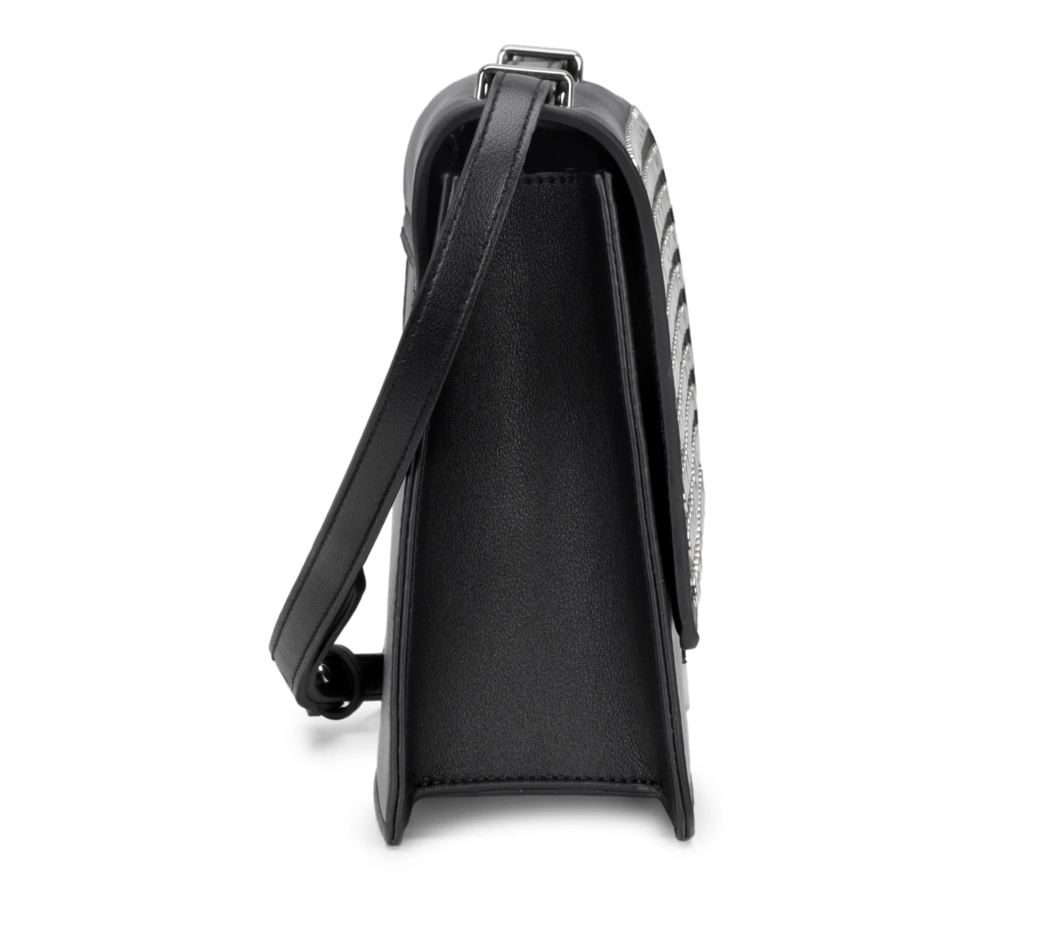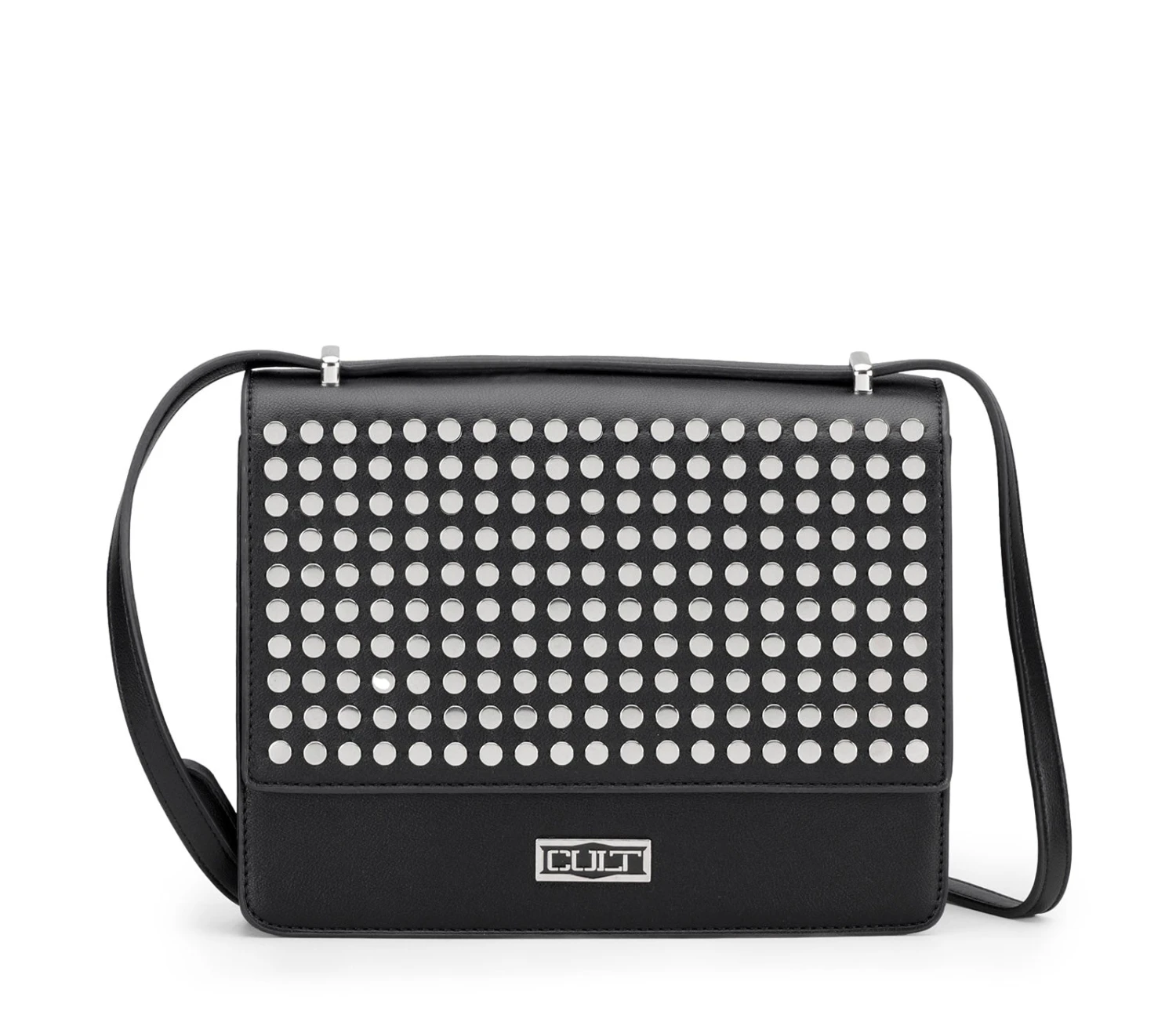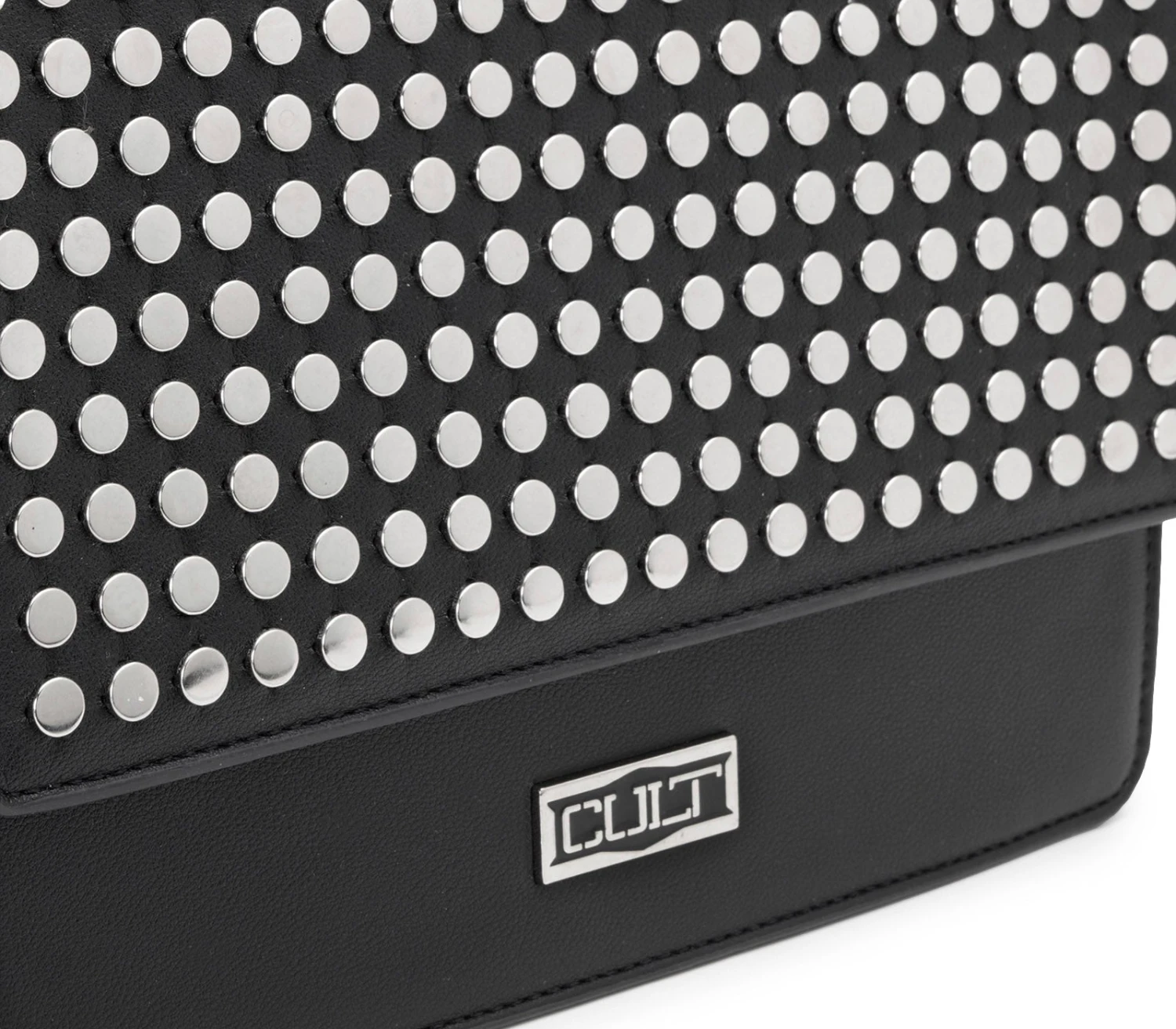 Infondete il vostro stile con la visione glam rock di Cult con questa borsa a tracolla. Realizzata in ecopelle nera, ha la caratteristica forma rettangolare e una tracolla regolabile. Si distingue per l’applicazione di borchie piatte in metallo silver su tutta la patta. La sfoggerete a spalla o a tracolla, per godervi i pomeriggi in città a mani libere. Chiusura magnetica. Dimensioni 24x17x7