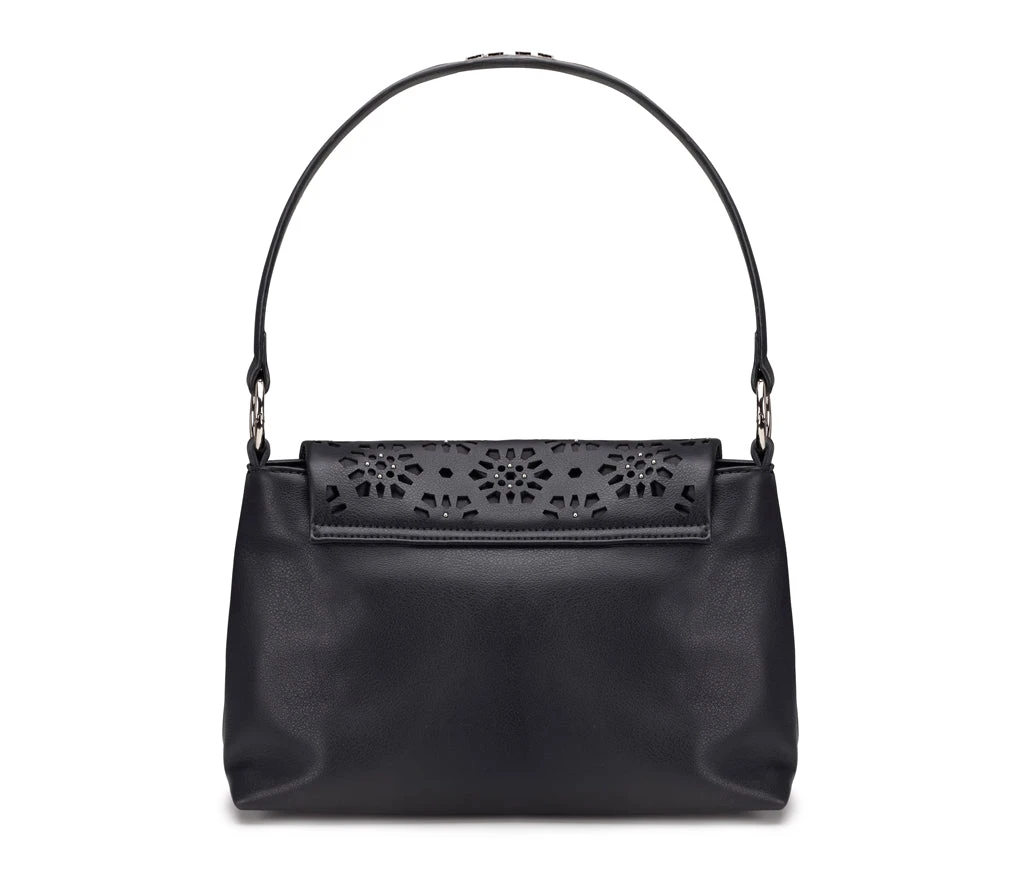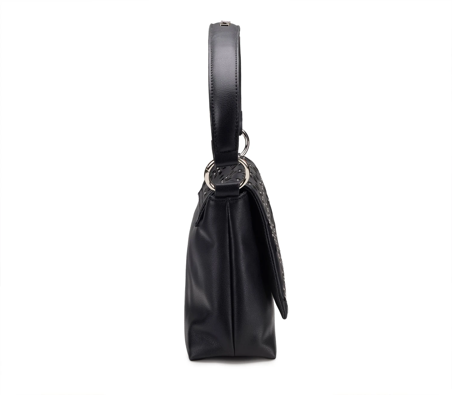 La nuova flap bag NINA in ecopelle nera firmata CULT, pensata per la stagione primavera-estate 2025, unisce eleganza e carattere. Arricchita da mini borchie bubble in metallo color argento, dettagli floreali cut-out e il logo lettering del brand, questa borsa aggiunge un tocco decisamente glam-rock al tuo look. Un vero must-have per non passare inosservata. Dimensioni: 24x16x9.
