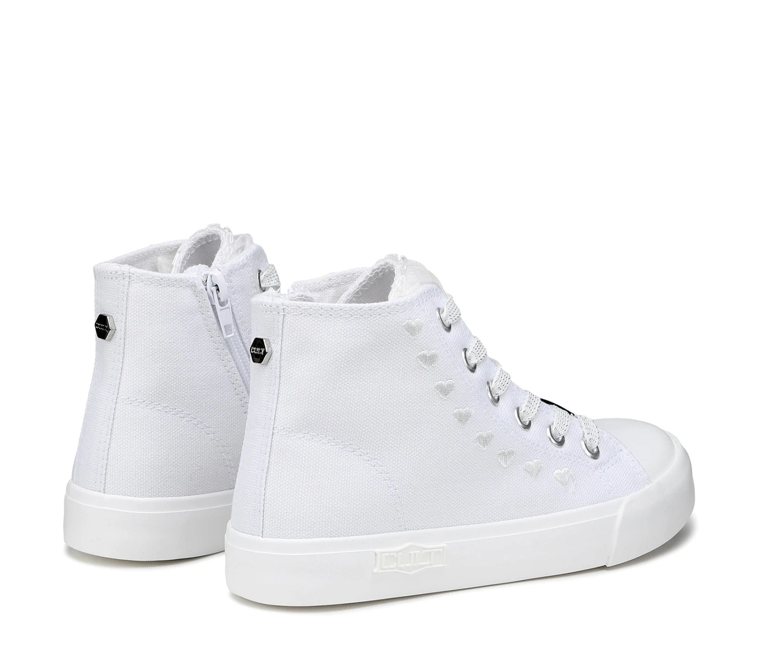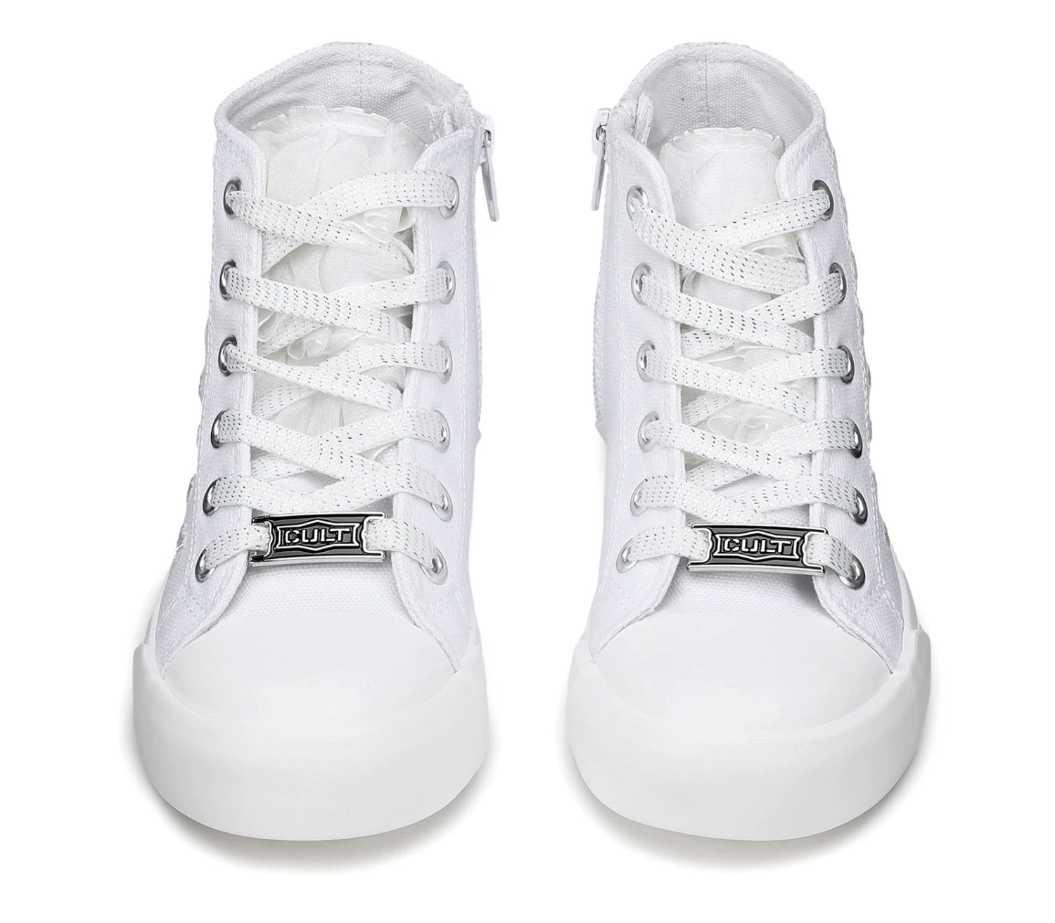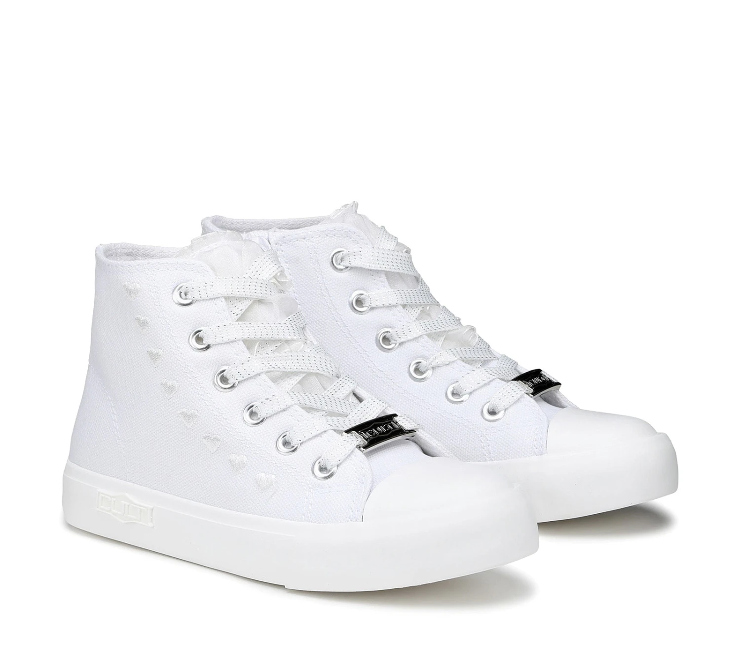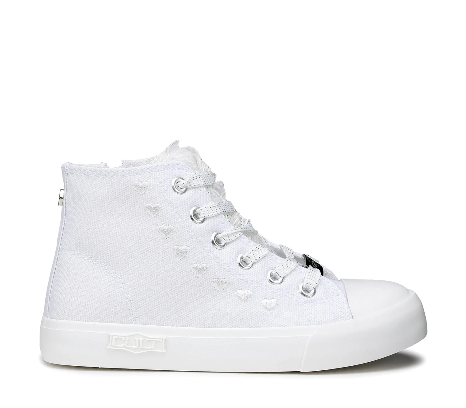 Questa stagione, Cult reinventa le classiche sneakers alte in canvas in versione Mini Me bianche con comode suole e punta in gomma. Rifinite con un’affascinante e briosa decorazione con borchie a forma di cuore sur ton e dettagli in tulle che sono in grado di entrare nel guardaroba dei più piccoli con molta facilità.