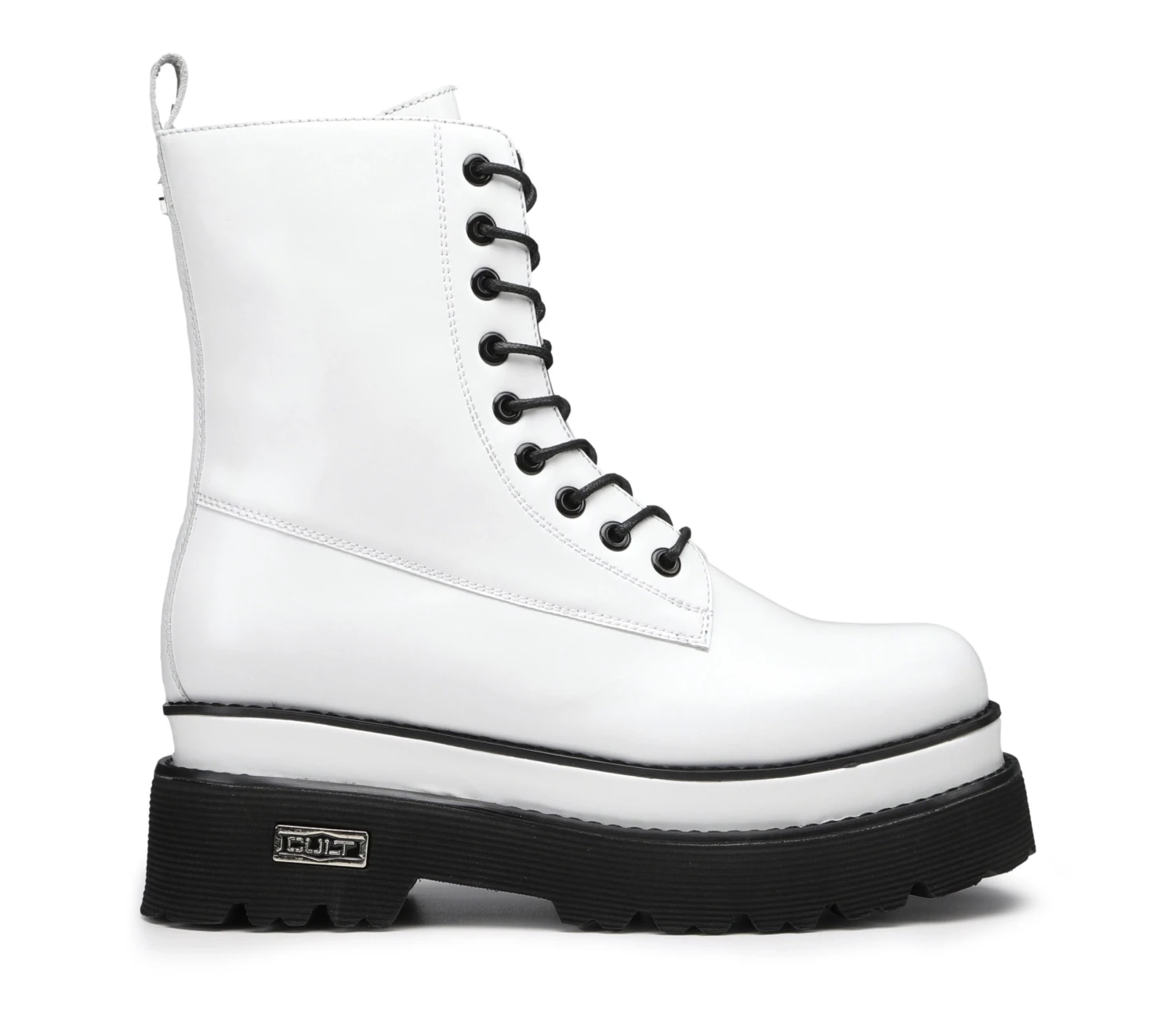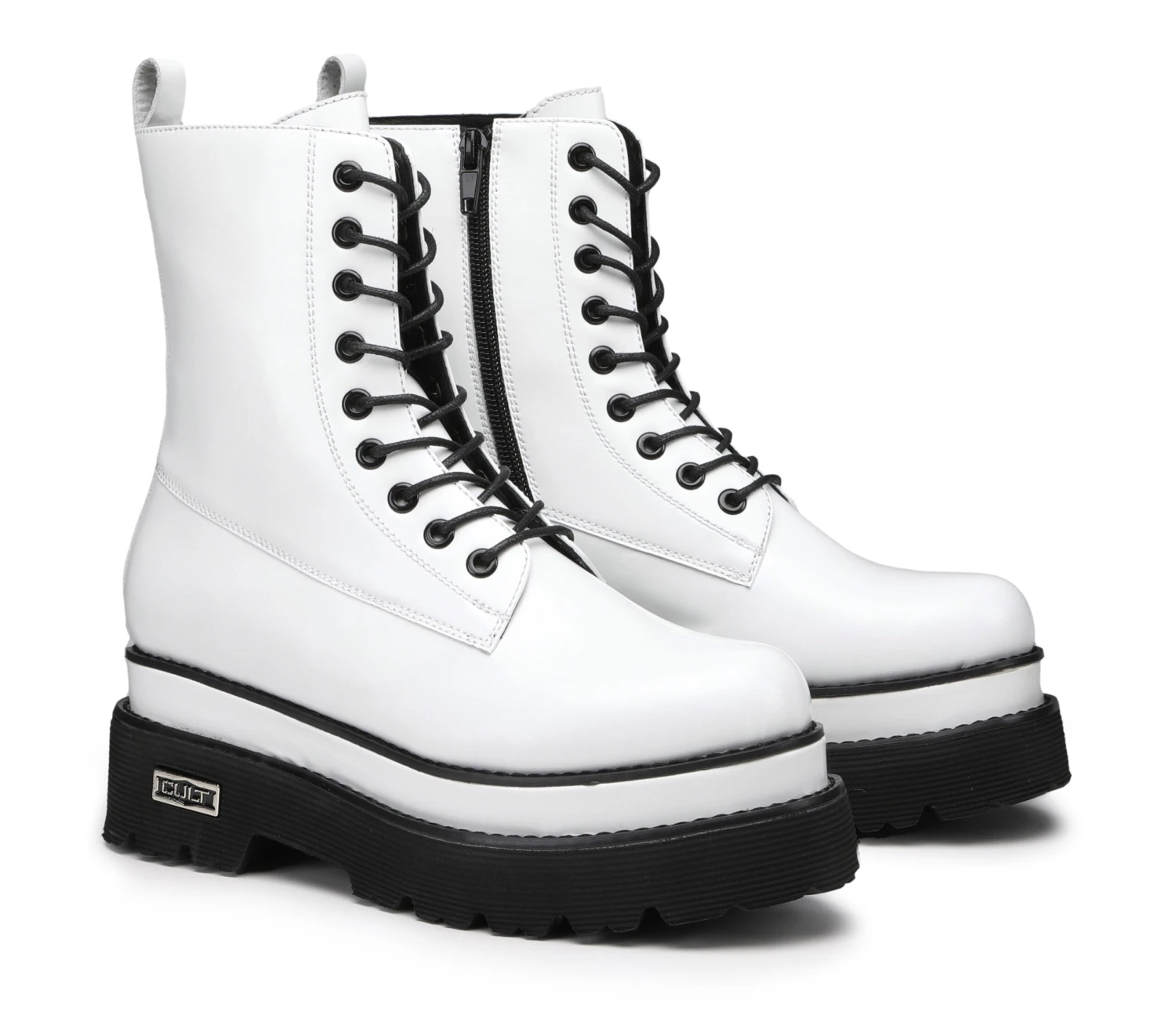 Grinta in stile Cult con gli anfibi in pelle spazzolata bianca proposti per la nuova stagione. Il modello nero si distingue per i lacci tono-su-tono, pull up posteriore e la suola chunky in gomma. Cambiate le vostre certezze in fatto di moda per convertirvi al nuovo stile deciso e ribelle.