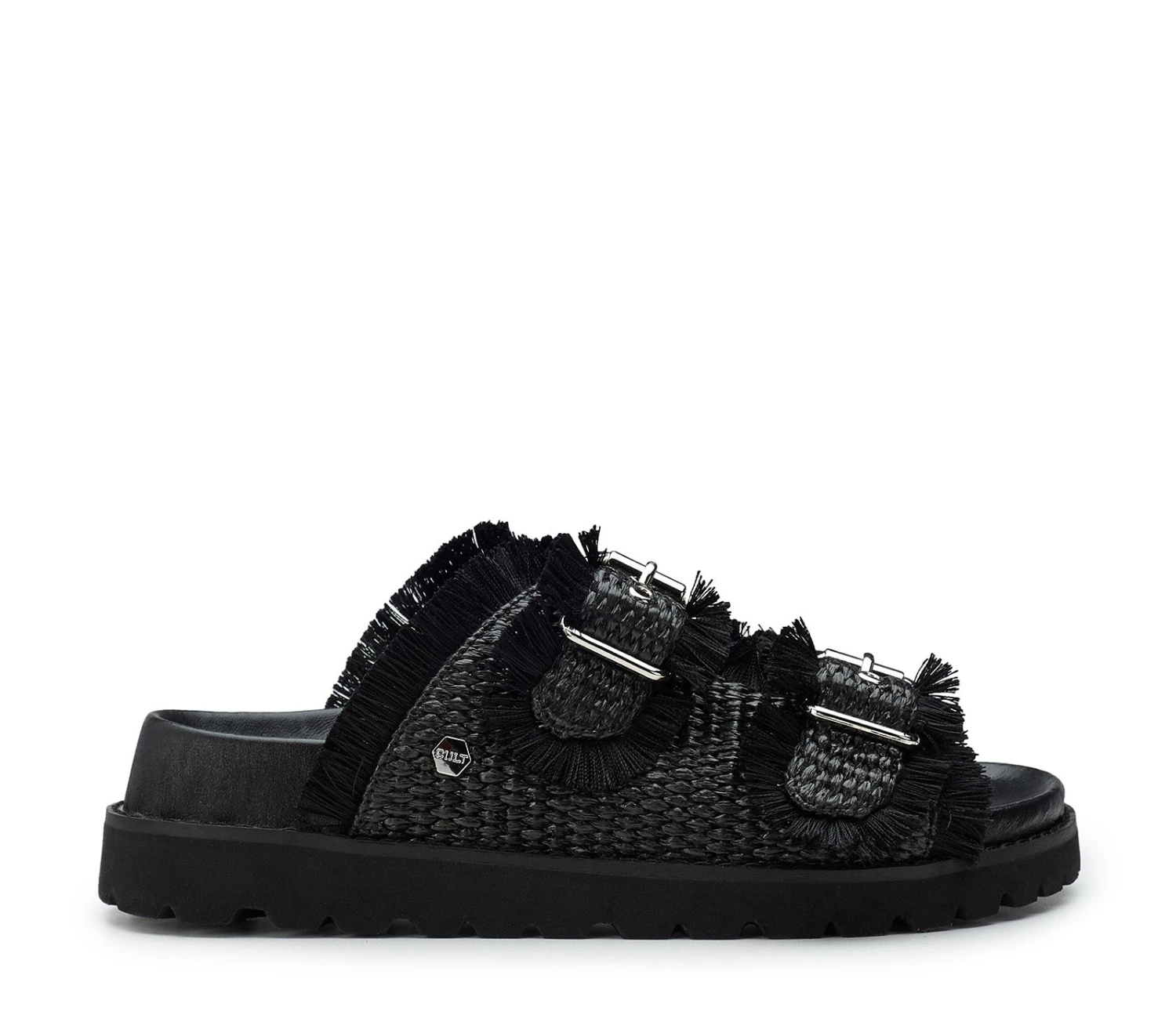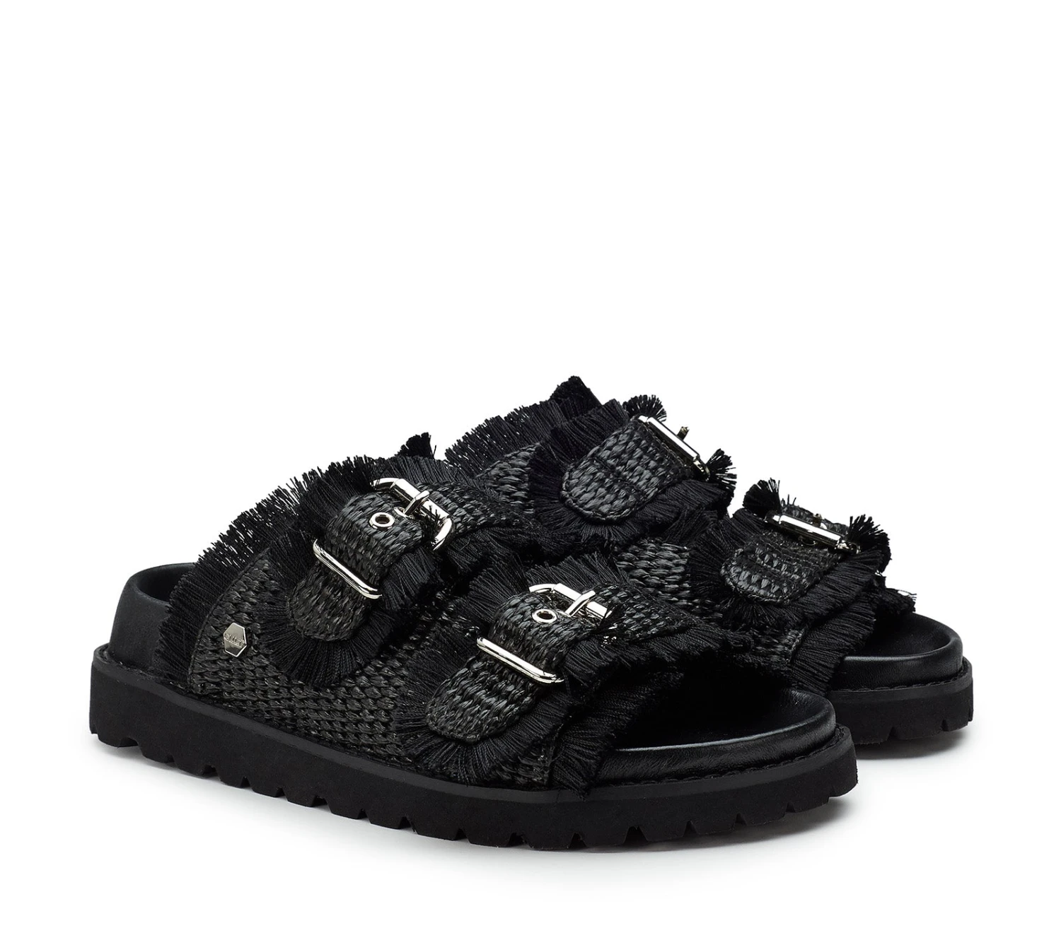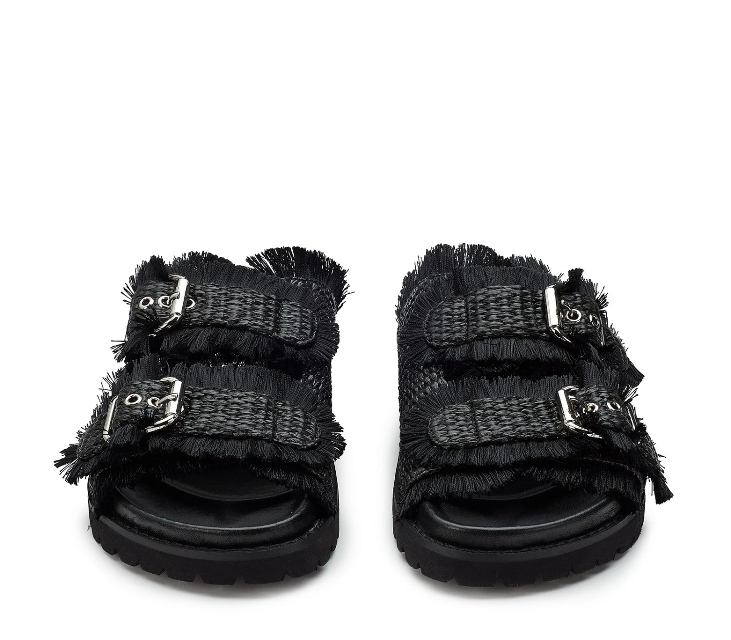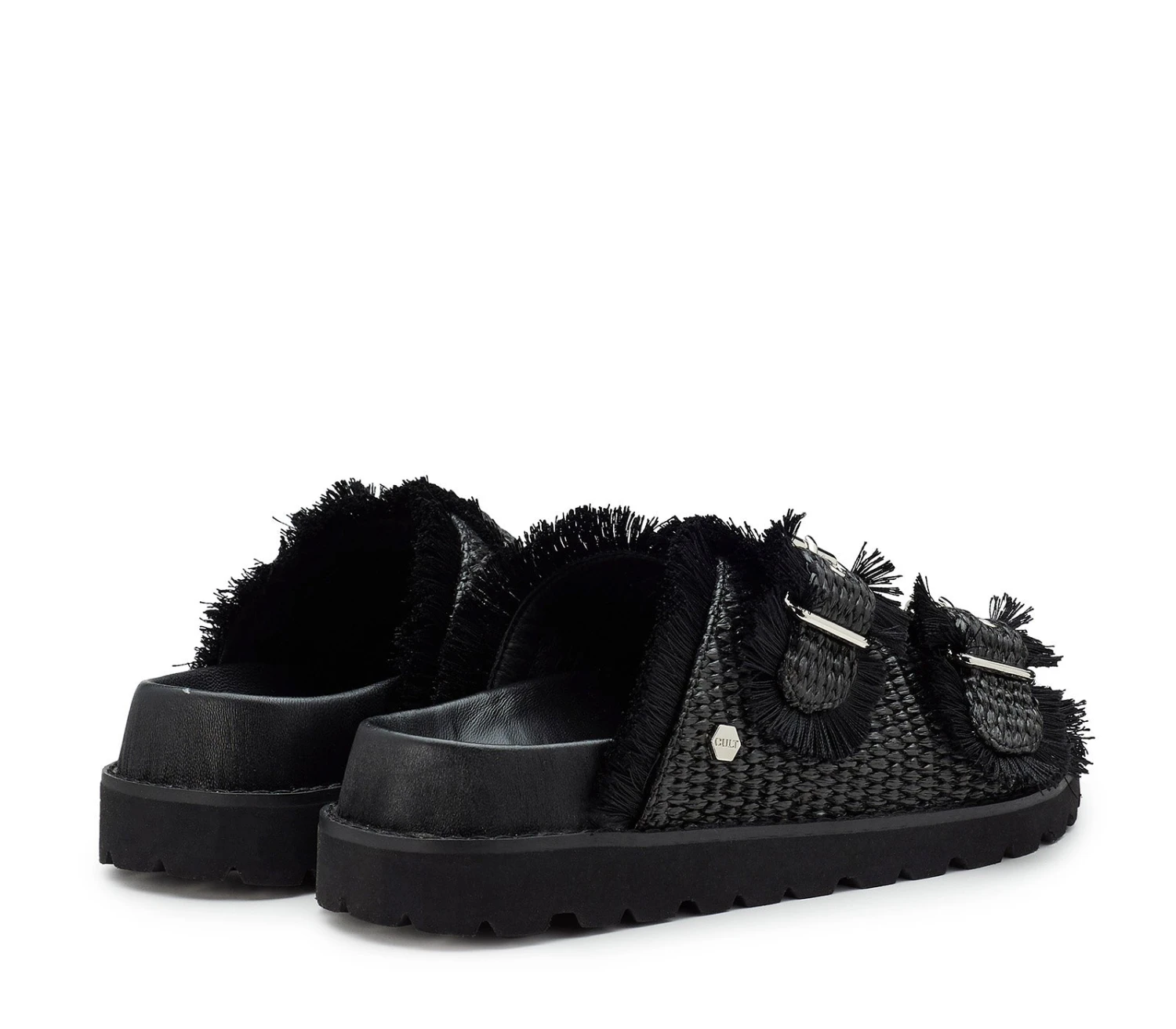 Lo stile inizia già dai piedi grazie ai sandali total black da donna firmati Cult. Realizzati in rafia con bordi sfrangiati, presentano due fasce impreziosite con fibbie metalliche e poggiano su un footbed rivestito in pelle con suola platform.