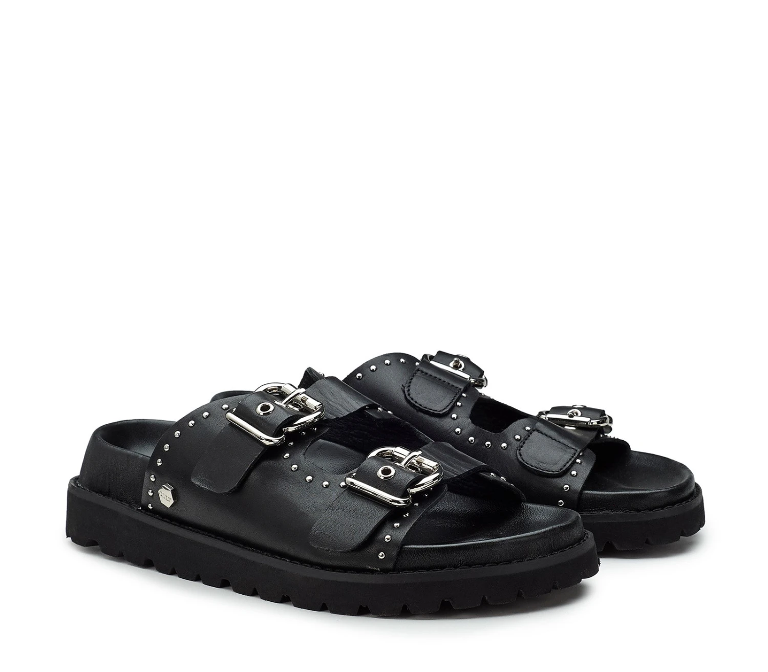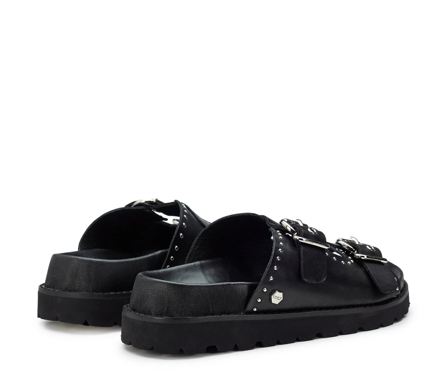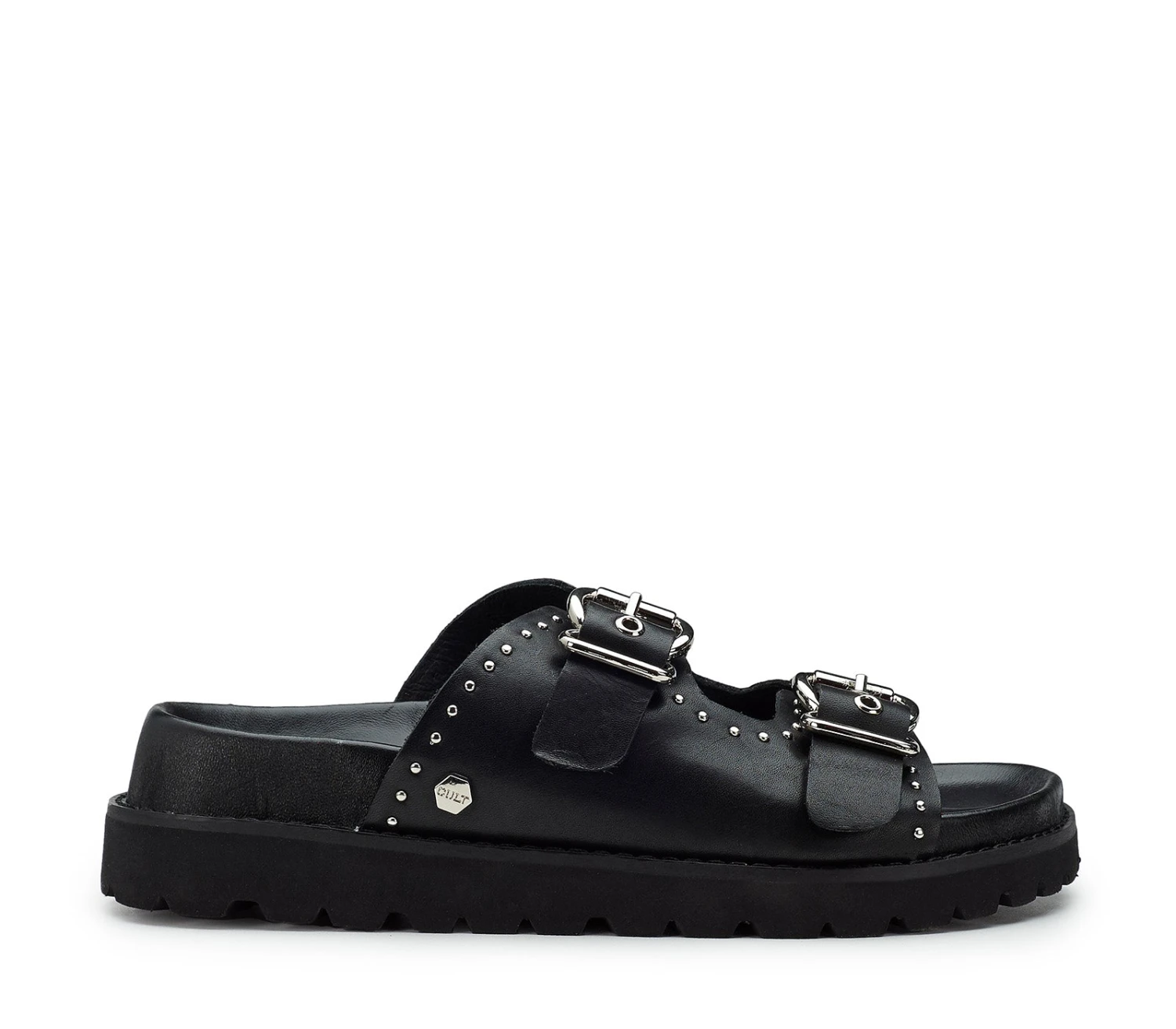 Lo stile inizia già dai piedi grazie ai sandali total black da donna firmati Cult. Realizzati in morbida pelle, presentano due fasche impreziosite con fibbie metalliche e mini borchie sferiche e poggiano su un footbed rivestito in pelle con suola platform.