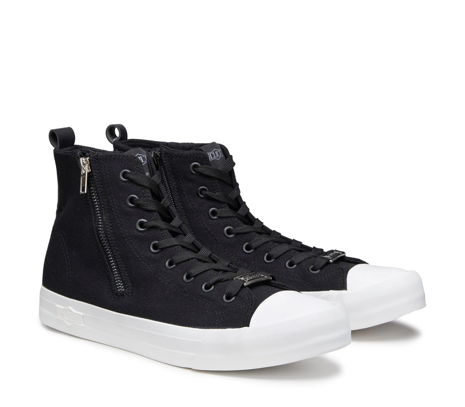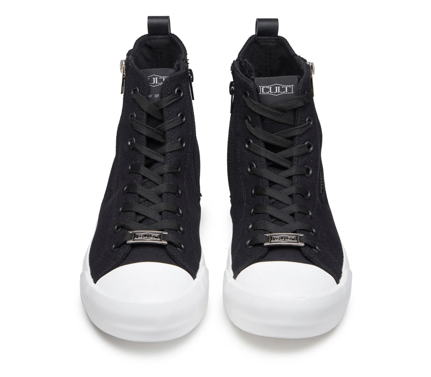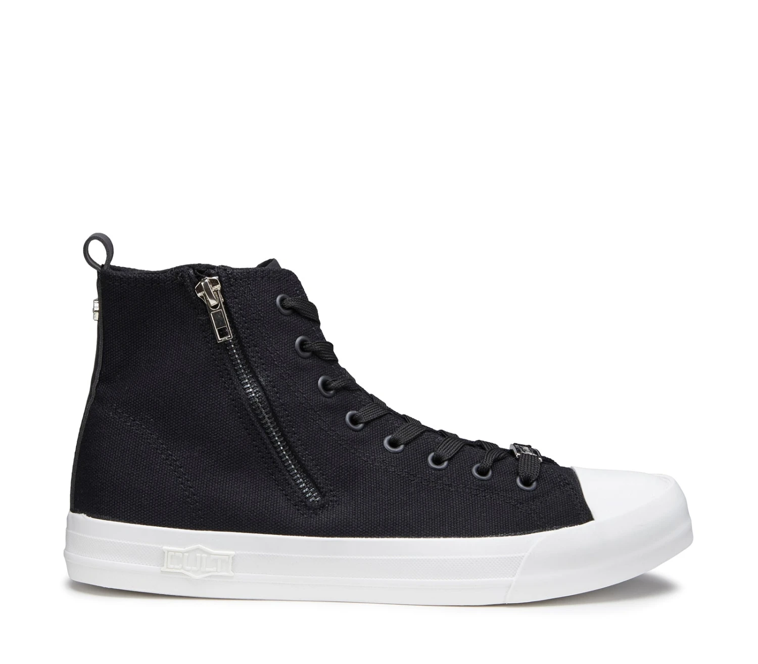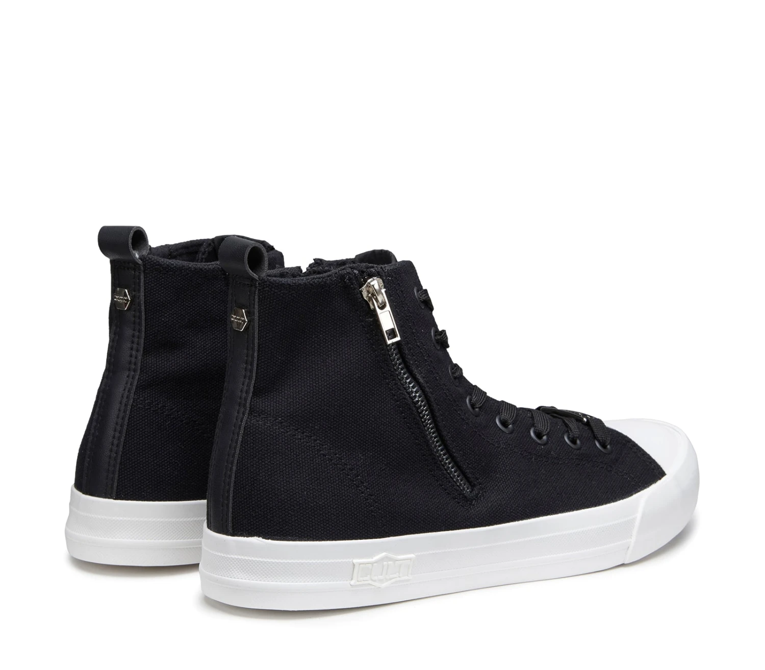 Le sneakers Placebo di Cult, disponibili in una nuance nero minimal, sono dotate di tomaia in canvas e suola in gomma, presentano una zip decorativa laterale e sfoggiano il distintivo codice del brand sulla parte esterna della suola.