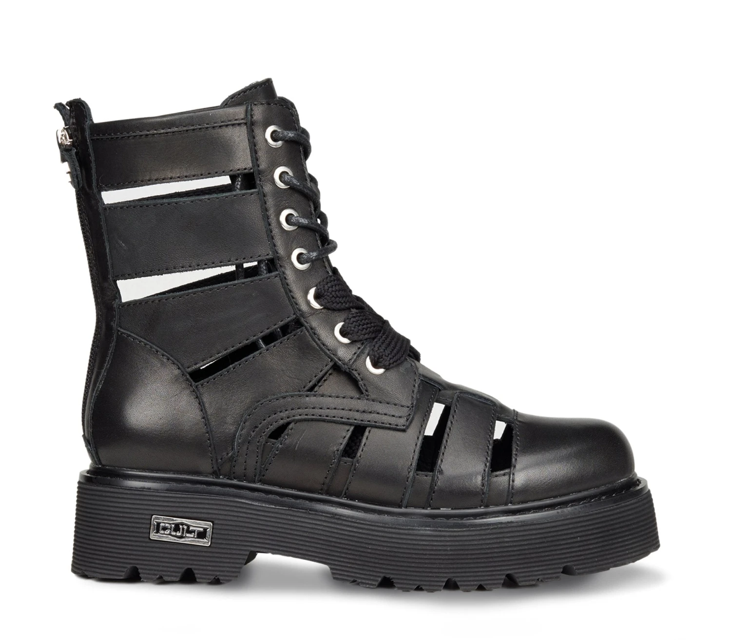 Rock e combattivi questi anfibi della famiglia Slash firmati Cult realizzati in pelle nera. Suola importante, chiusura tramite stringhe su occhielli silver e aperture sul collo e sul dorso del piede per un effetto ancora più femminile e grintoso. Altezza suola 5cm