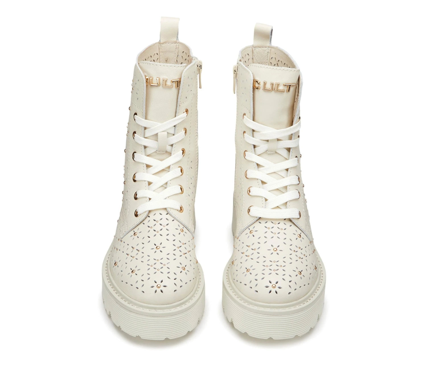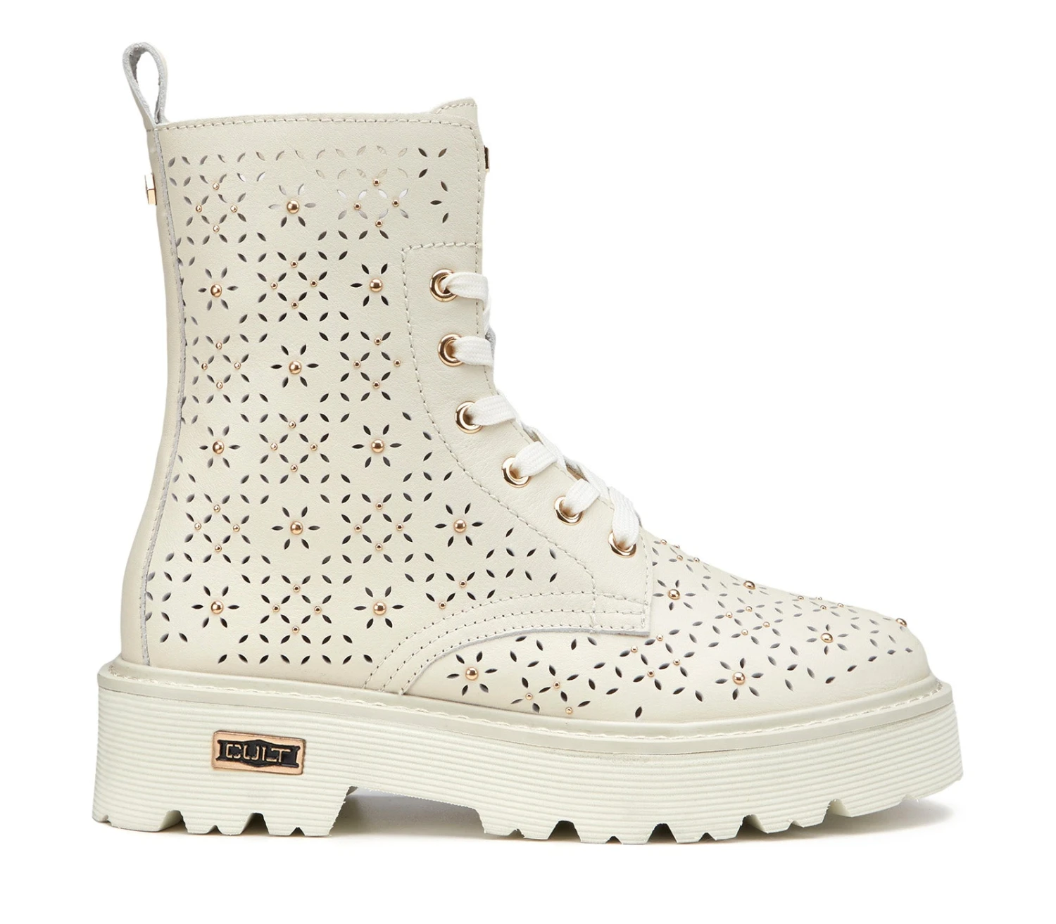 Spirito urbano e dettagli accattivanti si incontrano in questi anfibi in pelle con forature floreali, gentili e femminili e la nuance off-white che richiamano la sensazione della bella stagione. Questi anfibi in pieno stile Cult doneranno un tocco grintoso ai tuoi look casual. Chiusura tramite stringhe e zip interna, fondo in EVA