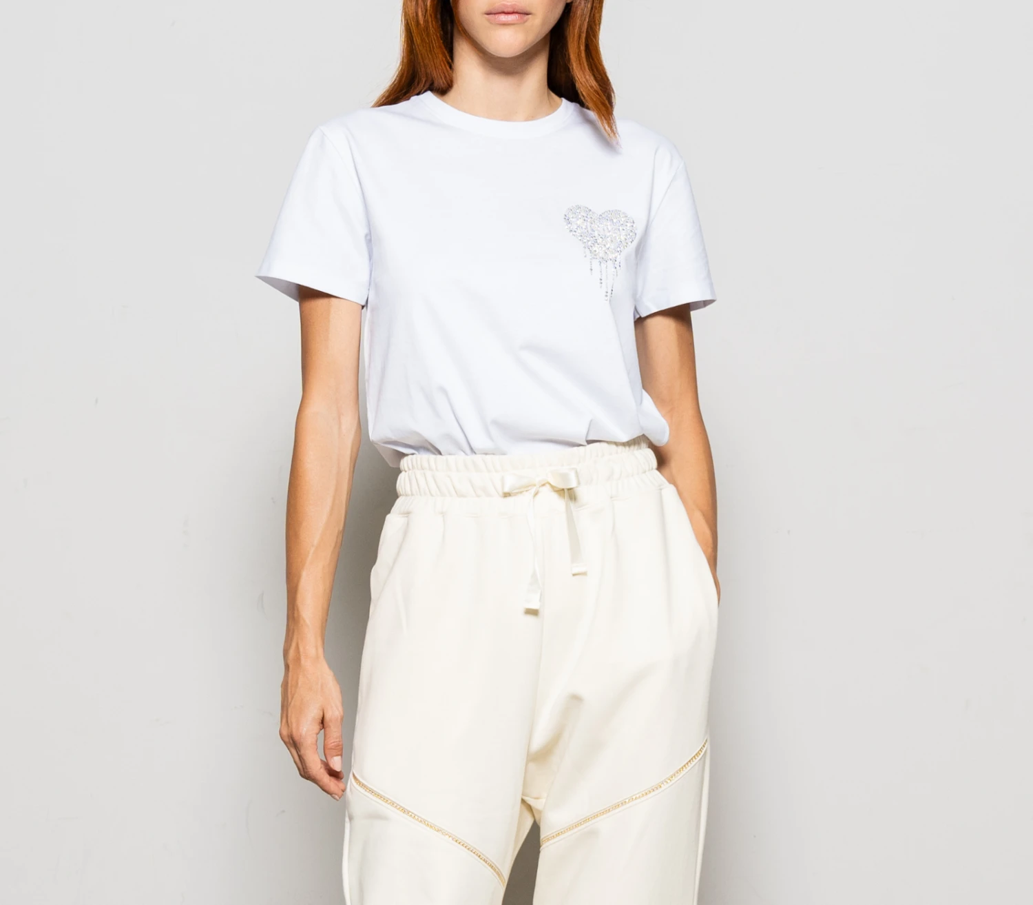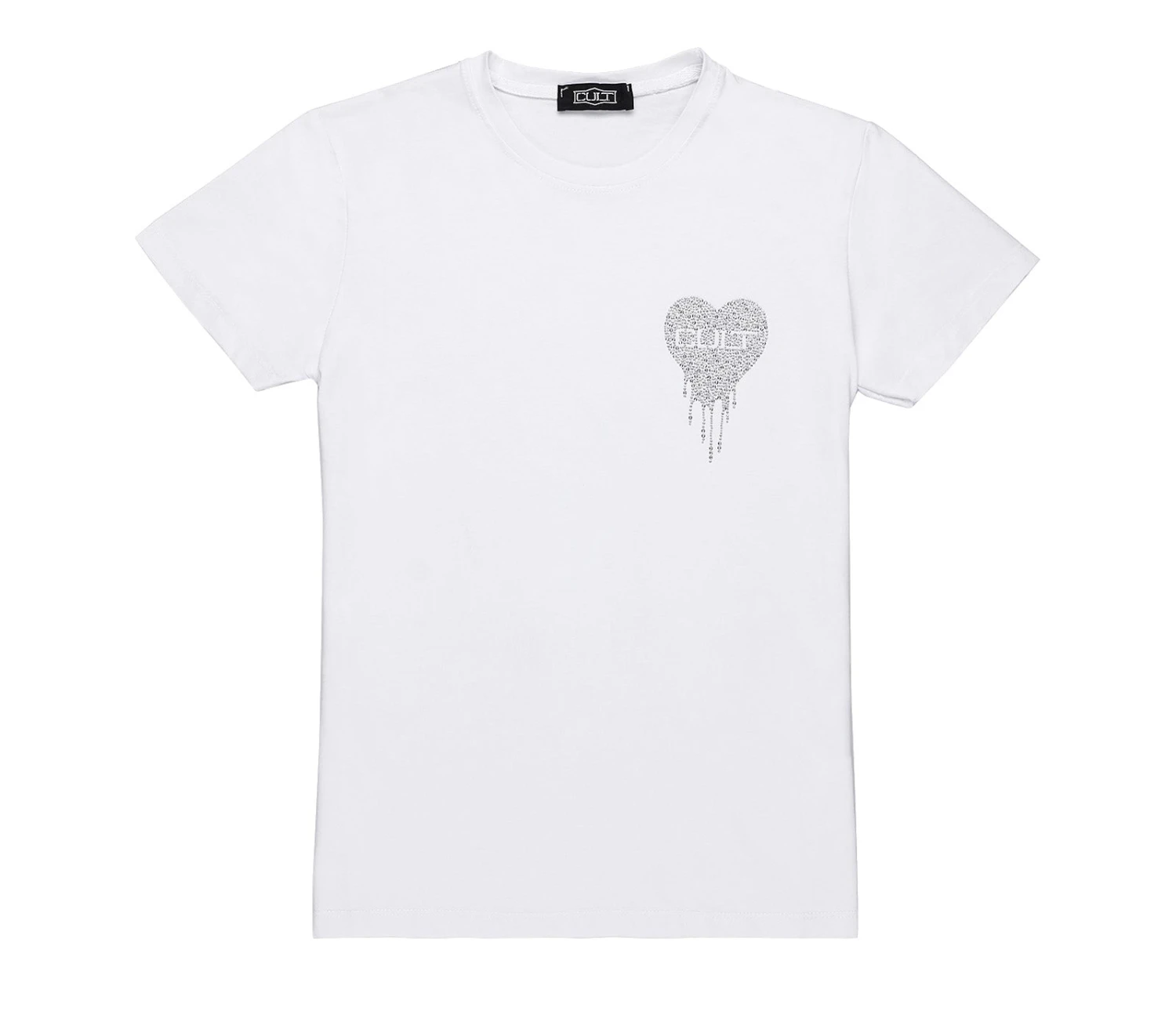Dichiarate il vostro amore per Cult indossando questa T-shirt bianca da donna della nuova collezione. Realizzata in puro cotone, presenta un dettaglio realizzato con le borchie e strass ed è rifinita con le maniche corte classiche, sarà il jolly di stile che non vi stancherete mai di indossare.