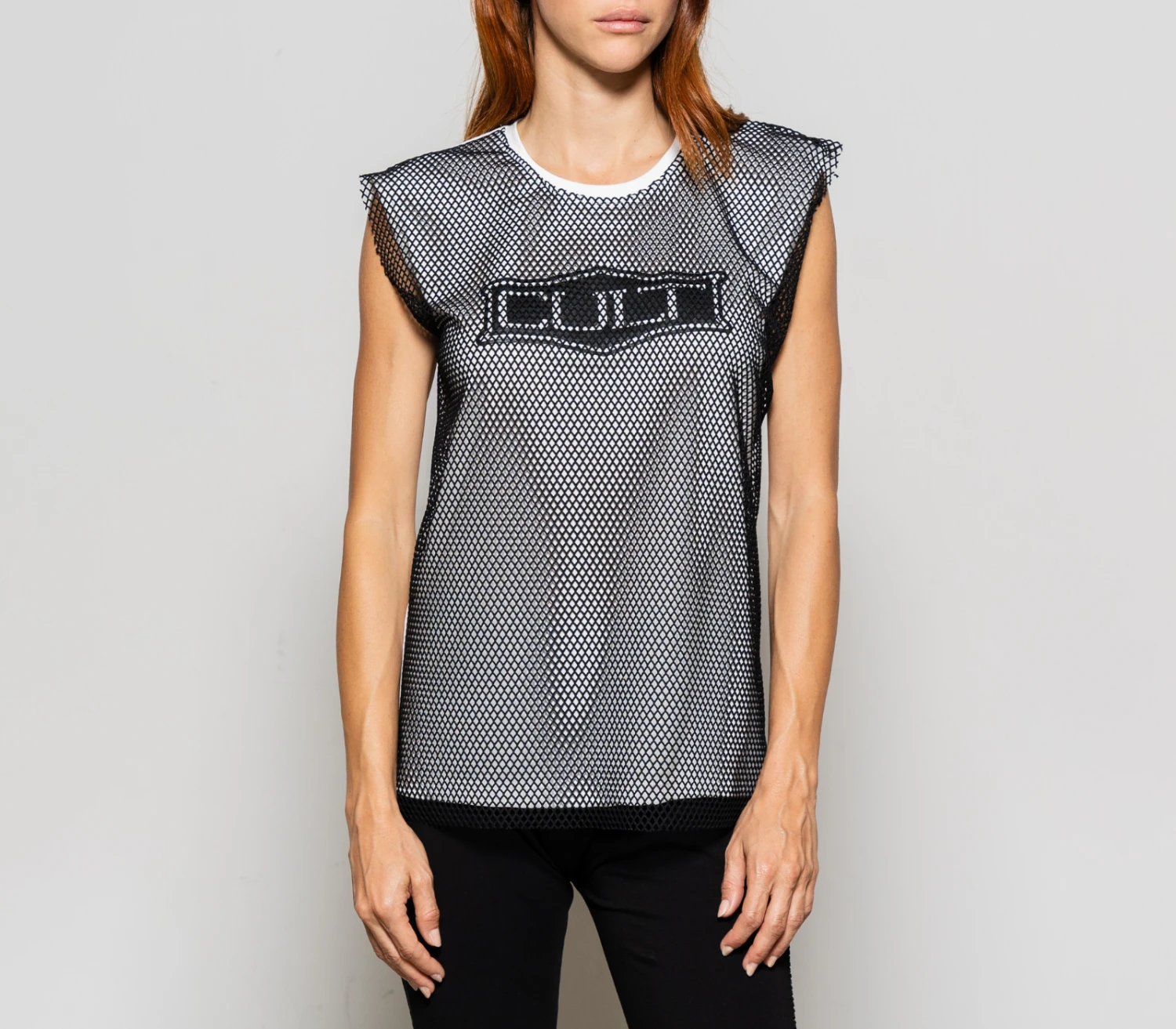 Dinamico e originale: il top in cotone con la rete a contrasto applicata sul davanrti definisce una femminilità sportiva e grintosa. Il modello smanicato ha una vestibilità morbida è perfetto da indossare con gli shorts e leggins per un look prettamente daily.