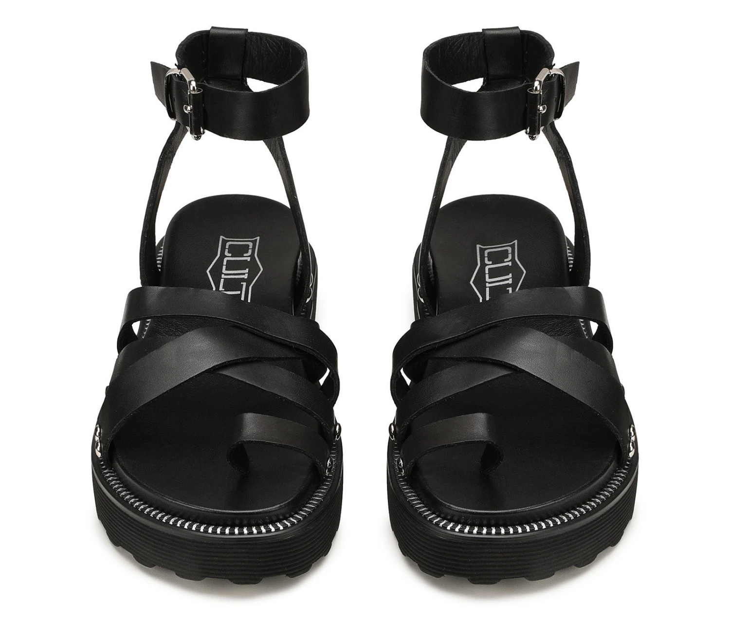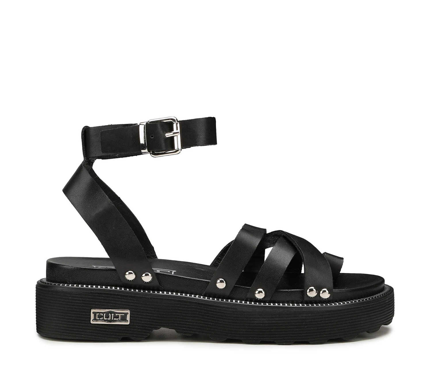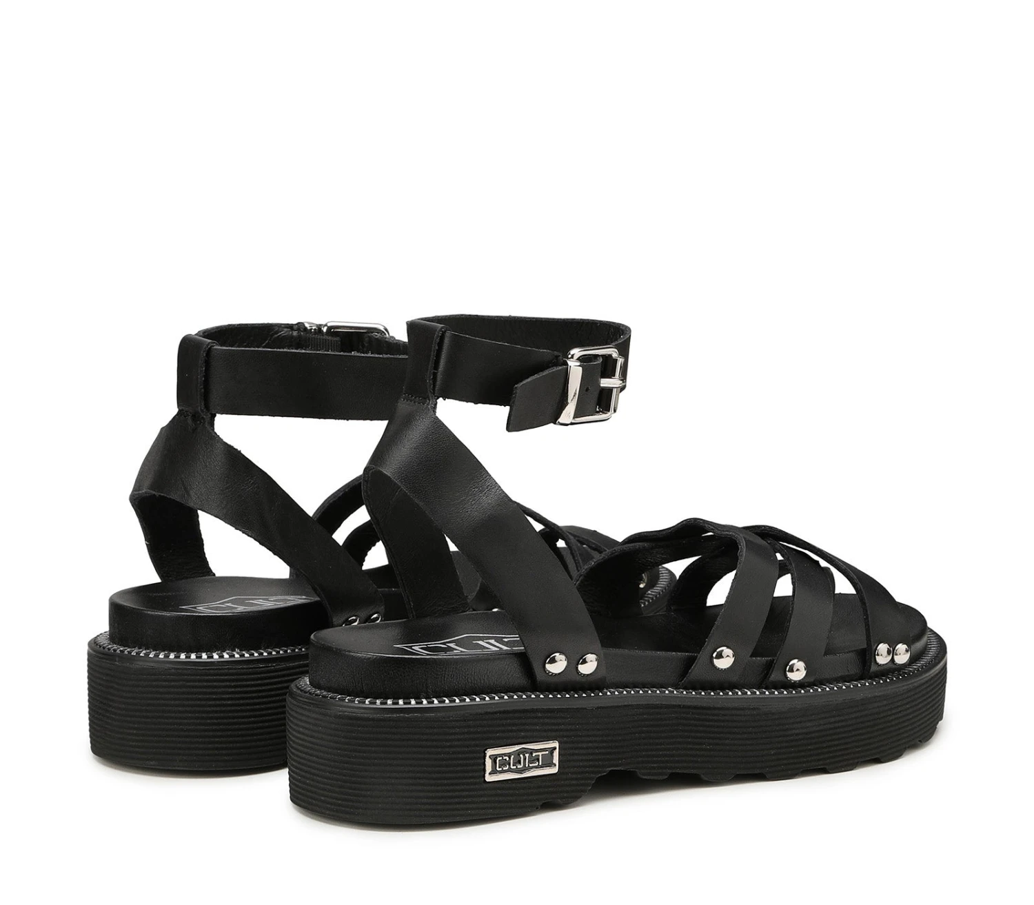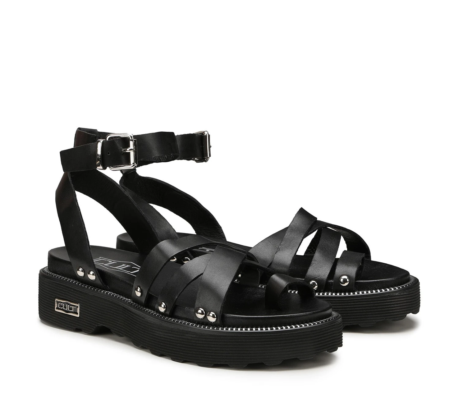 Immancabili nel guardaroba di stagione, i sandali chunky firmati Cult aggiungeranno carattere e stile ai vostri look estivi. Realizzati in pelle nera, presentano cinturini con borchie metalliche e poggiano su una generosa suola in gomma. Sceglieteli sia con shorts sia con abiti.